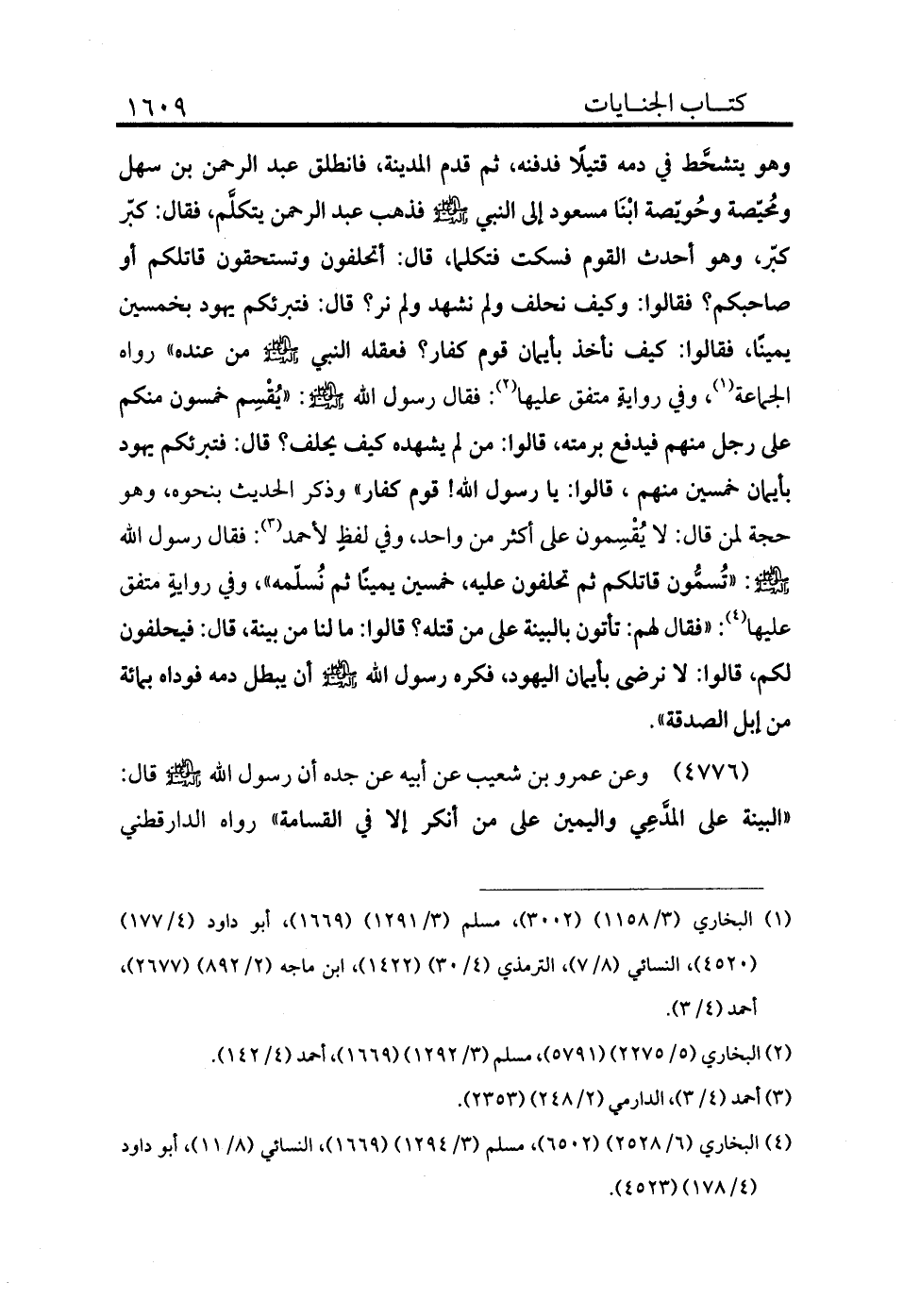 4777 - وعن عمرو بن شعيب عن أبيه عن جده أن رسول الله - صلى الله عليه وسلم - قال: «البينة على المدعي واليمين على من أنكر إلا في القسامة» رواه الدارقطني