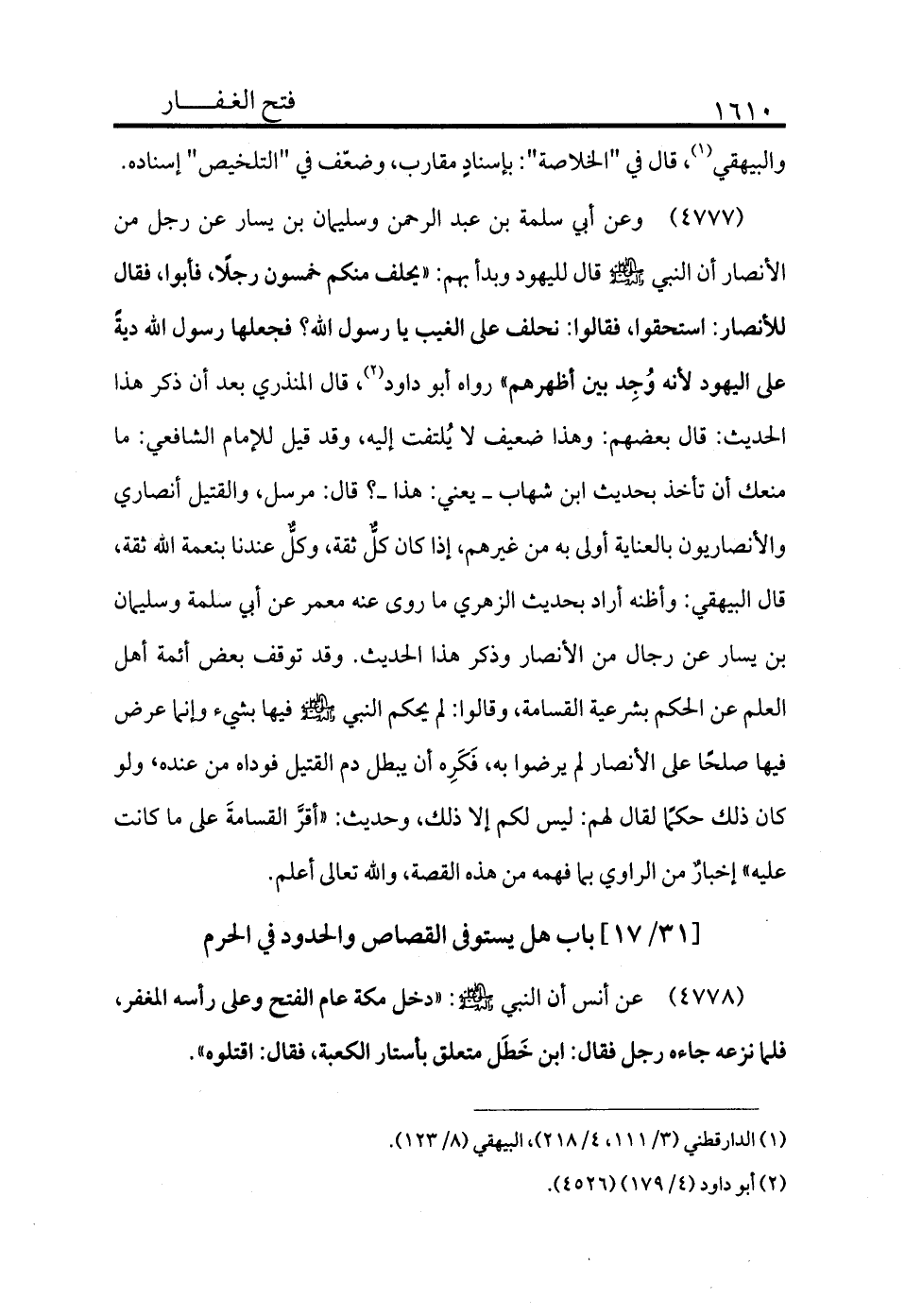 4778 - وعن أبي سلمة بن عبد الرحمن وسليمان بن يسار عن رجل من الأنصار أن النبي - صلى الله عليه وسلم - قال لليهود وبدأ بهم: «يحلف منكم خمسون رجلًا فأبوا فقال للأنصار: استحقوا، فقالوا: نحلف على الغيب يا رسول الله؟ فجعلها رسول الله دية على اليهود لأنه وجد بين أظهرهم» رواه أبو داود (¬2) قال المنذري بعد أن ذكر هذا الحديث: قال بعضهم: وهذا ضعيف لا يلتفت إليه وقد قيل للإمام الشافعي: ما منعك أن تأخذ بحديث ابن شهاب يعني: هذا، قال: مرسل والقتيل أنصاري والأنصاريون بالعناية أولى بهم من غيرهم، إذ كان كلٌ ثقة، وكل عندنا بنعمة الله ثقة، قال البيهقي: وأظنه أراد بحديث الزهري ما روى عنه معمر عن أبي سلمة وسليمان بن يسار عن رجال من الأنصار وذكر هذا الحديث. وقد توقف بعض أئمة أهل العلم عن الحكم بشرعية القسامة وقالوا: لم يحكم النبي صلى الله عيله وسلم فيها بشيء وإنما عرض فيها صلحًا على الأنصار لم يرضوا به فكره أن يبطل دم القتيل فودَّاه من عنده ولو كان ذلك حكمًا لقال لهم ليس لكم إلا ذلك. وحديث أقر القسامة على ما كانت عليه اخبار من الراوي بما فهمه من هذه القصة والله تعالى أعلم.