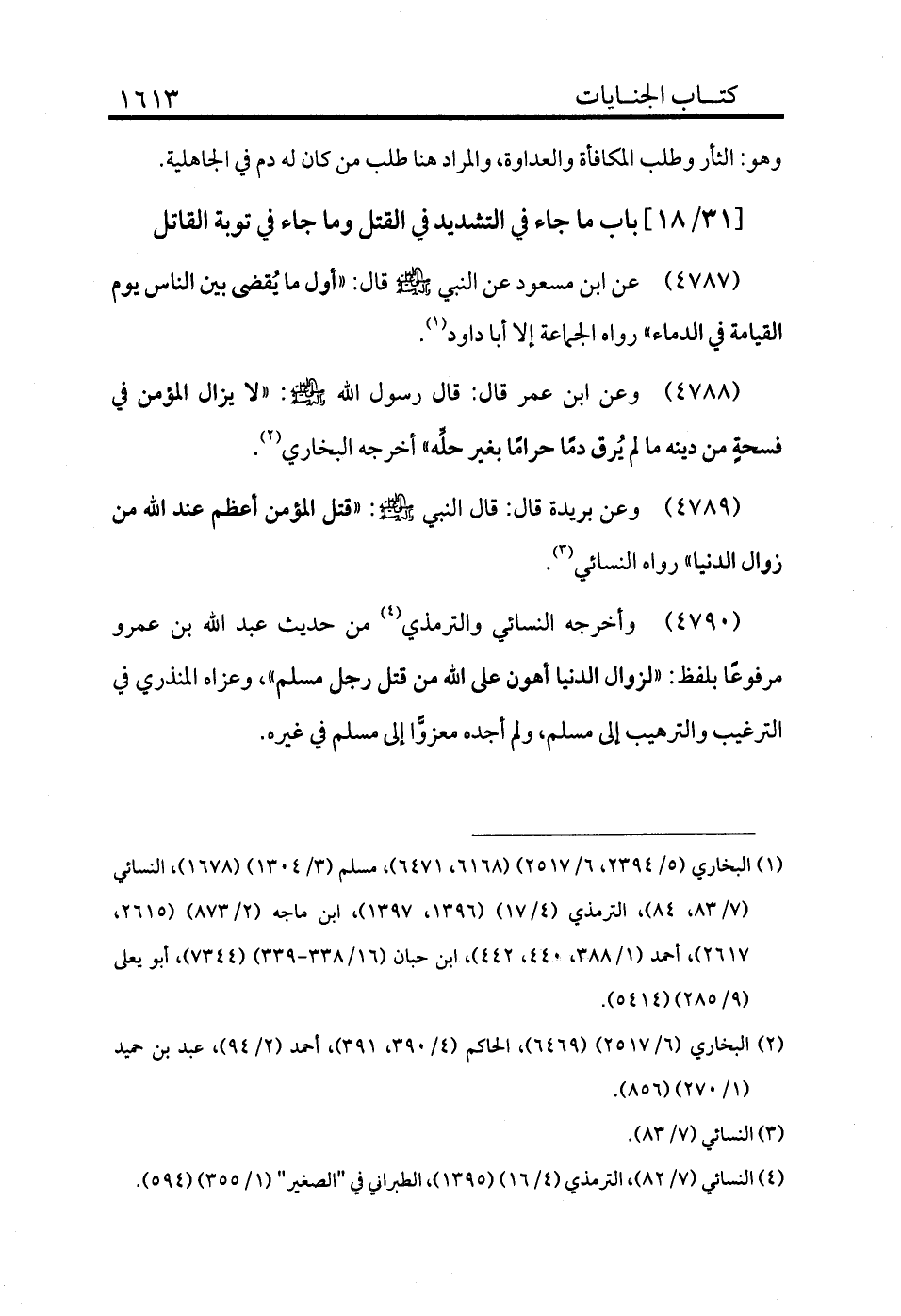 4791 - وأخرجه النسائي والترمذي (¬4) من حديث عبد الله بن عمرو مرفوعًا بلفظ: «لزوال الدنيا أهون على الله من قتل رجل مسلم» وعزاه المنذري في الترغيب والترهيب إلى مسلم ولم أجده معزوًا إلى مسلم في غيره.