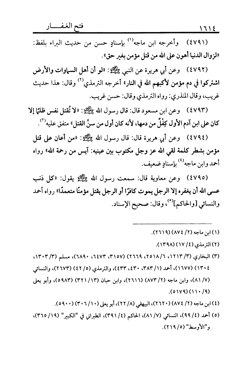 4792 - وأخرجه ابن ماجة (¬1) بإسناد حسن من حديث البراء بلفظ: «لزوال الدنيا أهون على الله من قتل مؤمن بغير حق» .