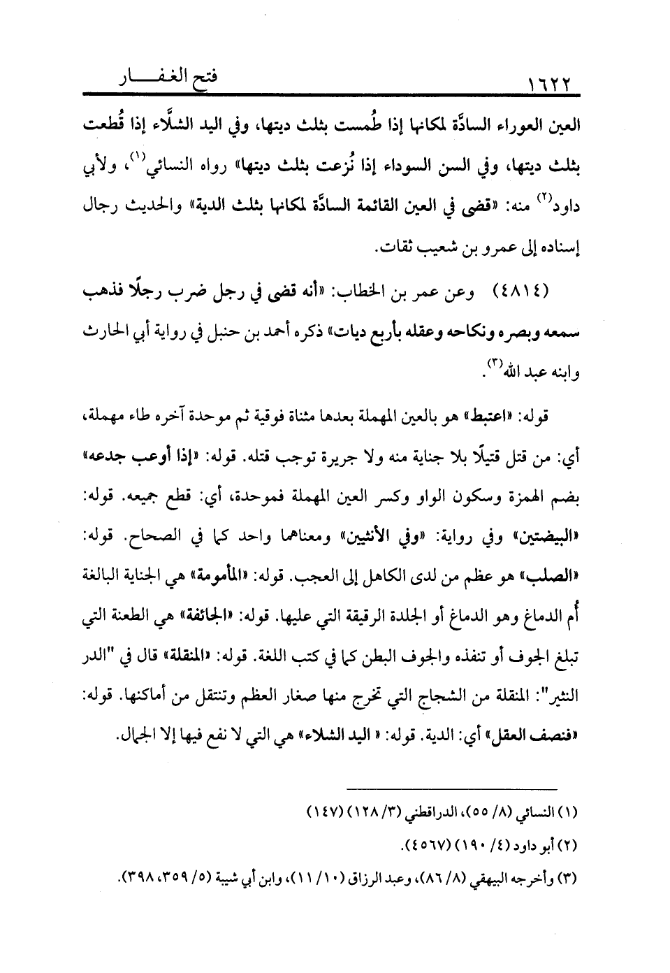 قوله: «اعتبط» هو بالعين المهملة بعدها مثناة فوقية ثم موحدة آخره مهملة: أي من قتل قتيلًا بلا جناية منه ولا جريرة توجب قتله. قوله: «إذا أوعب جدعه» بضم الهمزة وسكون الواو وكسر العين المهملة فموحدة أي قطع جميعه. قوله: «البيضتين» وفي رواية وفي الانثيين ومعناهما واحد كما في الصحاح. قوله: «الصلب» هو عظم من لدي الكاهل إلى العجب. قوله: «المأمومة» هي الجناية البالغة أُم الدماغ وهو الدماغ أو الجلدة الرقيقة التي عليها. قوله: «الجايفة» هي الطعنة التي تبلغ الجوف أو تنفذه والجوف البطن كما في كتب اللغة. قوله: «المنقلة» قال في "الدر النثير": المنقلة من الشجاج التي تخرج منها صغار العظم وتنتقل من أماكنها. قوله: فنصف العقل أي الدية. قوله: «اليد الشلاء» هي التي لا نفع فيها إلا الجمال.