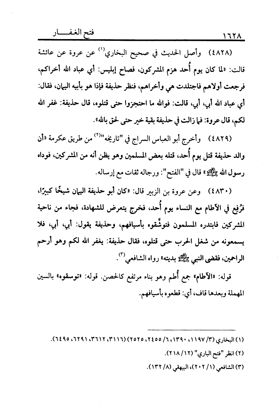 4830 - وأخرج أبو العباس السراج في "تاريخه" (¬2) من طريق عكرمة «أن والد حذيفة قتل يوم أُحد قتله بعض المسلمين وهو يظن أنه من المشركين فوداه رسول الله - صلى الله عليه وسلم -» قال في "الفتح": ورجاله ثقات مع إرساله.