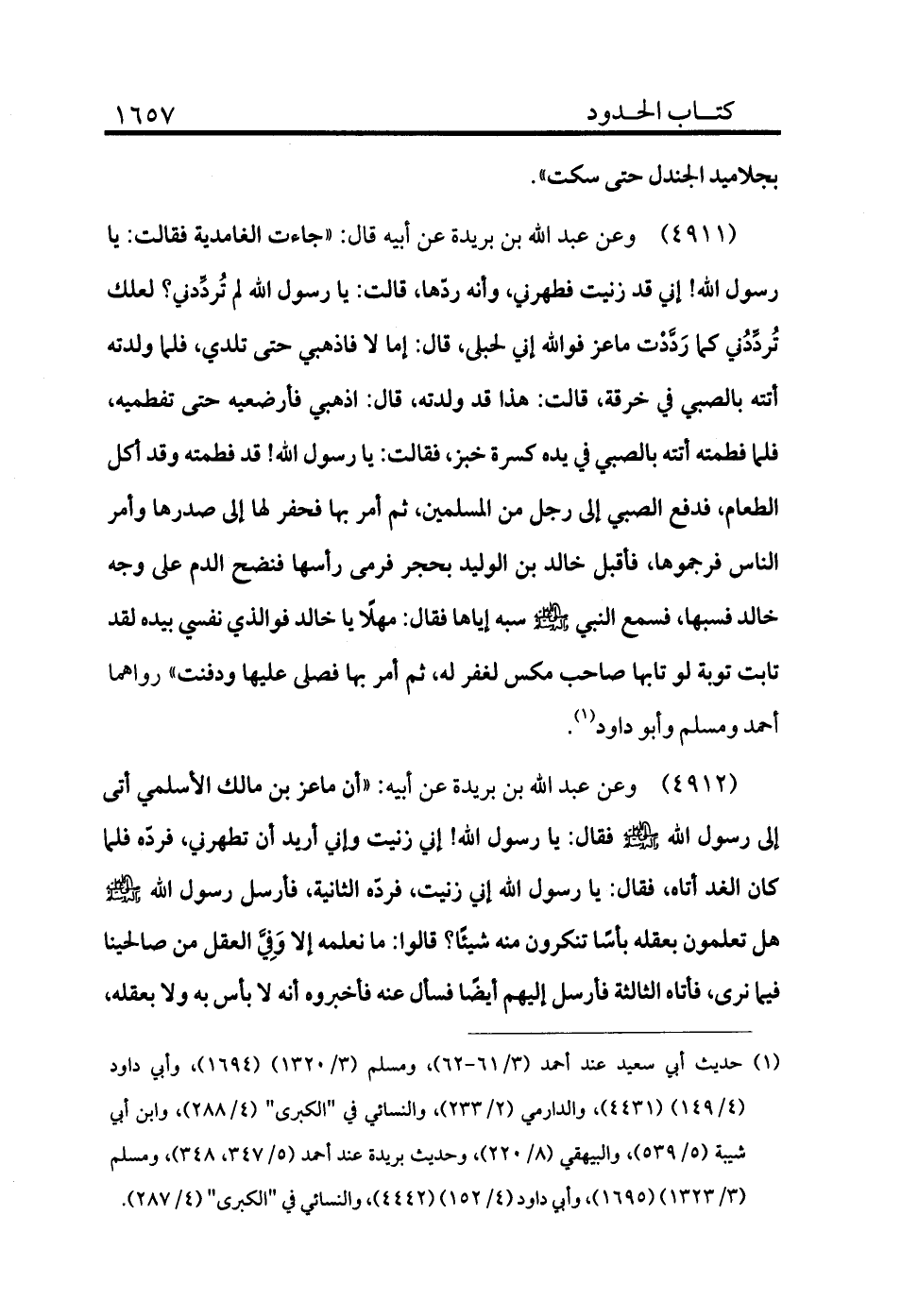 4912 - وعن عبد الله بن بريدة عن أبيه «أن ماعز بن مالك الأسلمي أتى إلى رسول الله - صلى الله عليه وسلم - فقال: يا رسول الله! إني زنيت وإني أريد أن تطهرني فرده فلما كان الغد أتاه، فقال: يا رسول الله إني زنيت فرده الثانية، فأرسل رسول الله - صلى الله عليه وسلم - هل تعلمون بعقله باسًا تنكرون منه شيئًا قالوا: ما نعلمه إلا وفي العقل من صالحينا فيما نرى، فأتاه الثالثة فأرسل إليهم أيضًا فسأل عنه فأخبروه أنه لا بأس به ولا بعقله