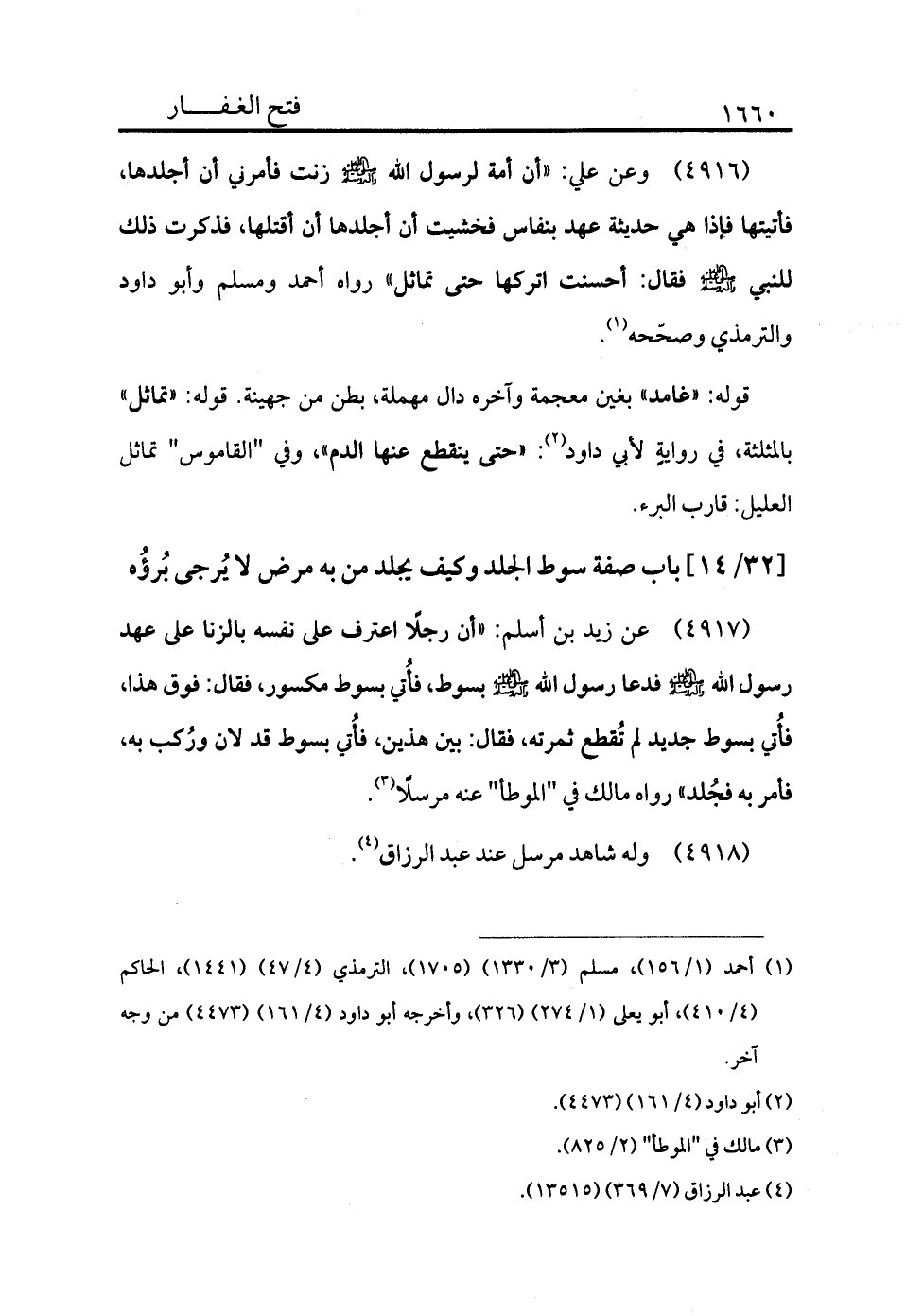 4916 - وعن علي «أن أمة لرسول الله - صلى الله عليه وسلم - زنت فأمرني أن أجلدها فأتيتها فإذا هي حديثة عهد بنفاس فخشيت أن أجلدها أن أقتلها فذكرت ذلك للنبي - صلى الله عليه وسلم - فقال: أحسنت اتركها حتى تماثل» رواه أحمد ومسلم وأبو داود والترمذي وصححه (¬1) .