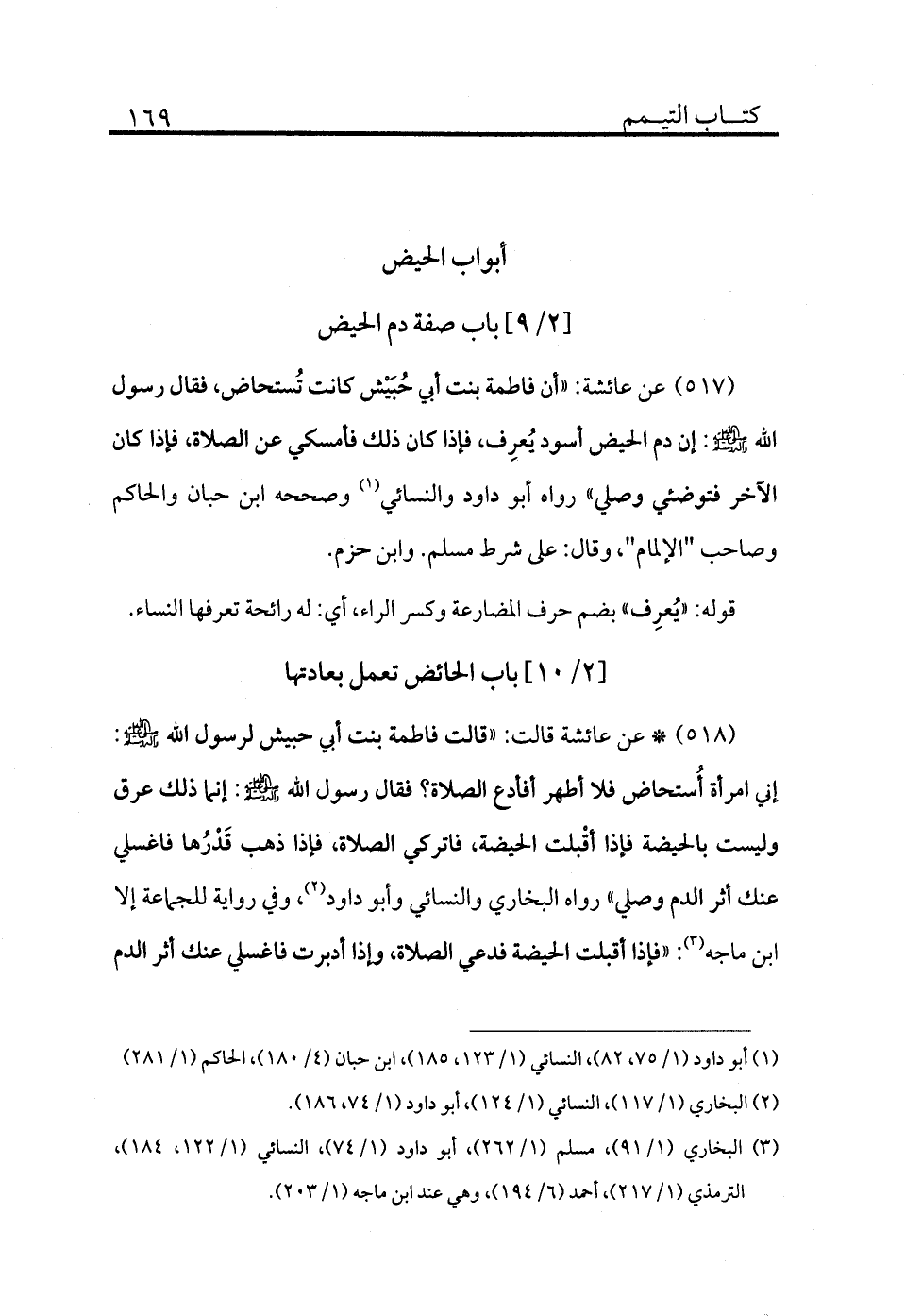 517 - عن عائشة: «أن فاطمة بنت أبي حُبَيْش كانت تُستحاض، فقال رسول الله - صلى الله عليه وسلم -: إن دم الحيض أسود يُعرِف، فإذا كان ذلك فأمسكي عن الصلاة، فإذا كان الآخر فتوضئي وصلي» رواه أبو داود والنسائي (¬1) وصححه ابن حبان والحاكم وصاحب "الإلمام"، وقال: على شرط مسلم، وابن حزم.