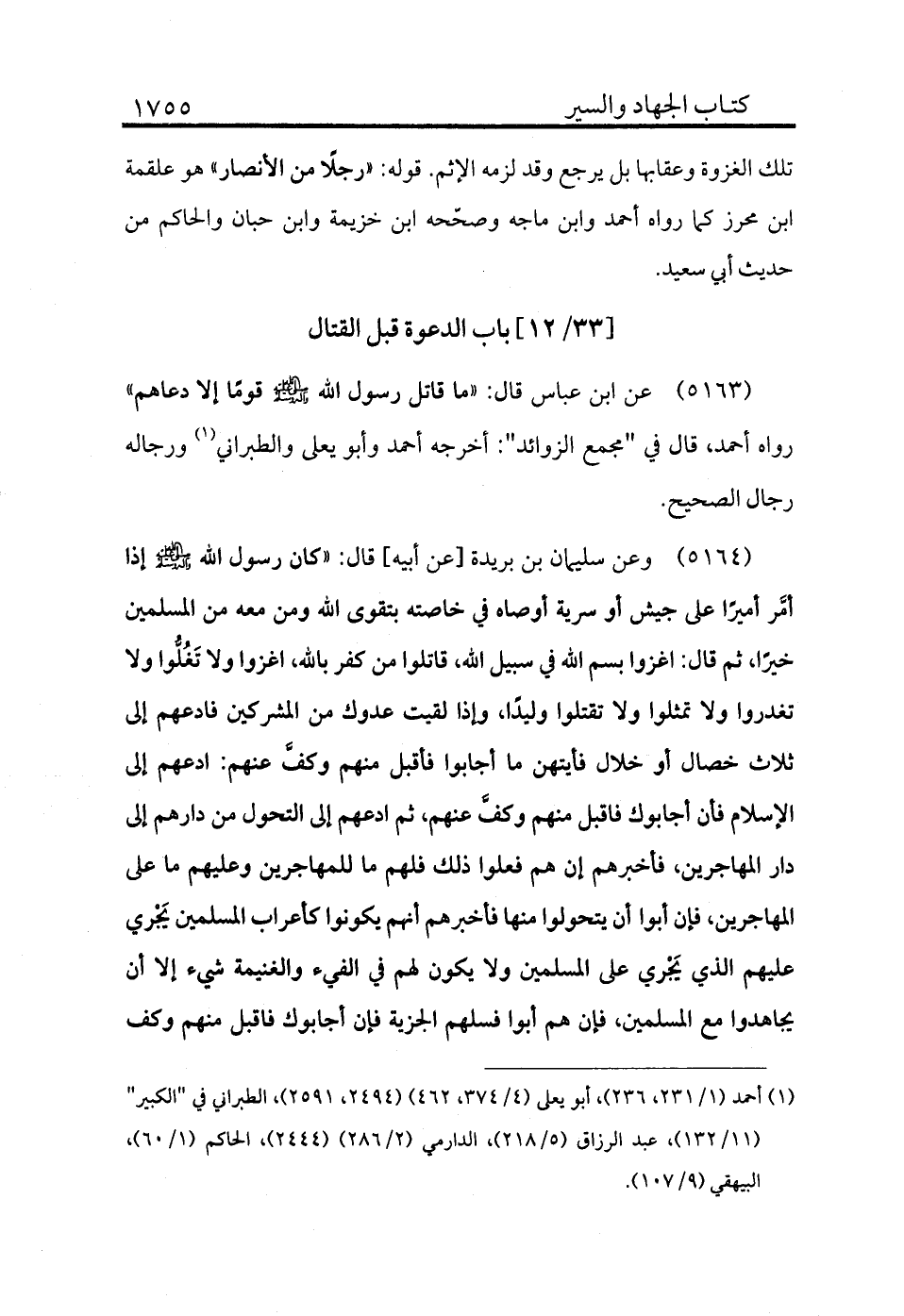 5163 - عن ابن عباس قال: «ما قاتل رسول الله - صلى الله عليه وسلم - قومًا إلا دعاهم» رواه أحمد، قال في "مجمع الزوائد" أخرجه أحمد وأبو يعلى والطبراني (¬1) ورجاله رجال الصحيح.