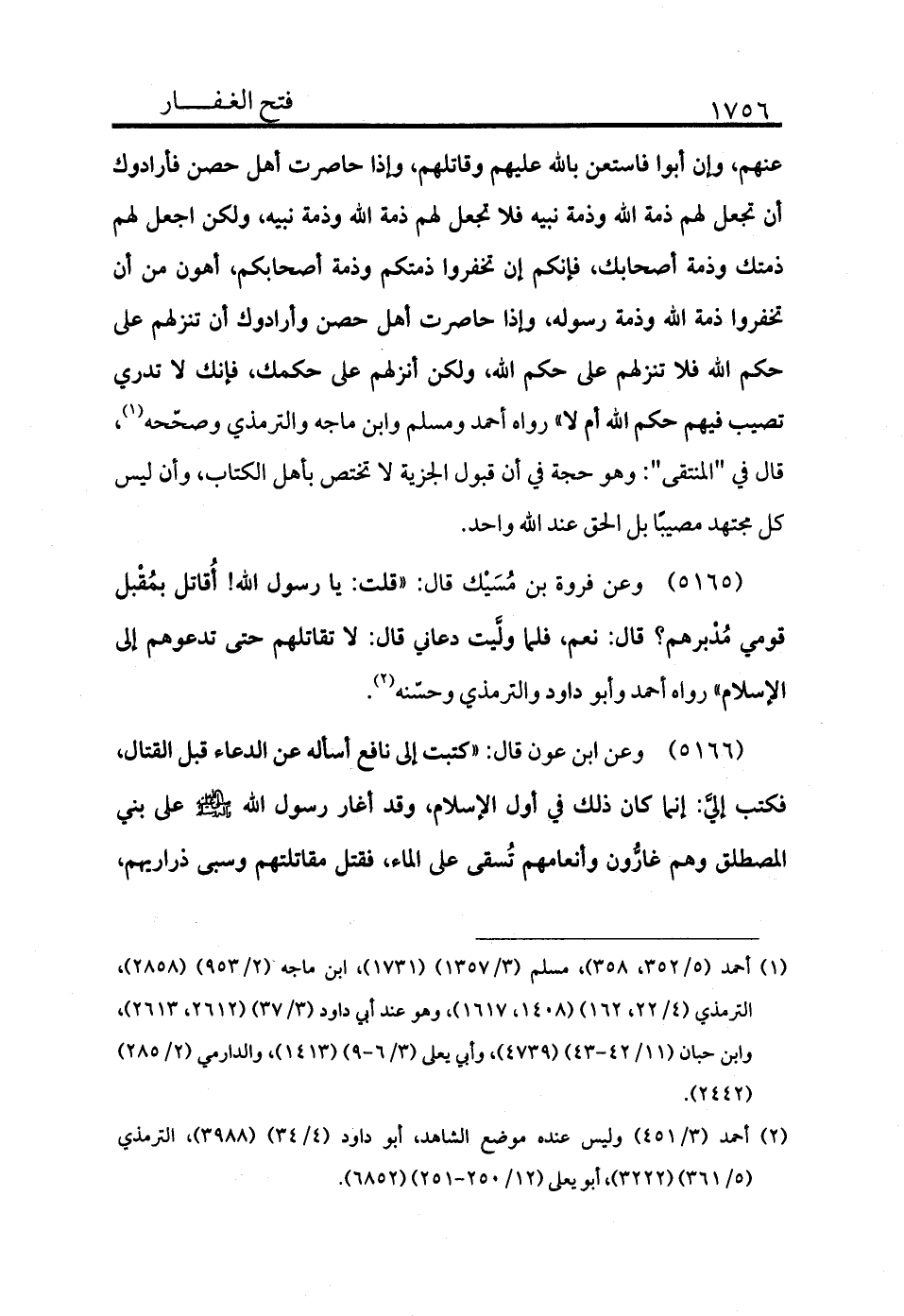 5165 - وعن فروة بن مسيك قال: «قلت: يا رسول الله! أُقاتل بمقبل قومي مدبرهم؟ قال: نعم فلما وليت دعاني، قال: لا تقاتلهم حتى تدعوهم إلى الإسلام» رواه أحمد وأبو داود والترمذي وحسنه (¬2) .