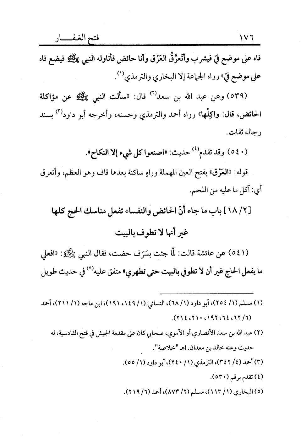 539 - وعن عبد الله بن سعد (¬2) قال: «سألت النبي - صلى الله عليه وسلم - عن مواكلة الحائض، قال: واكِلْها» رواه أحمد والترمذي وحسنه، وأخرجه أبو داود (¬3) بسند رجاله ثقات.