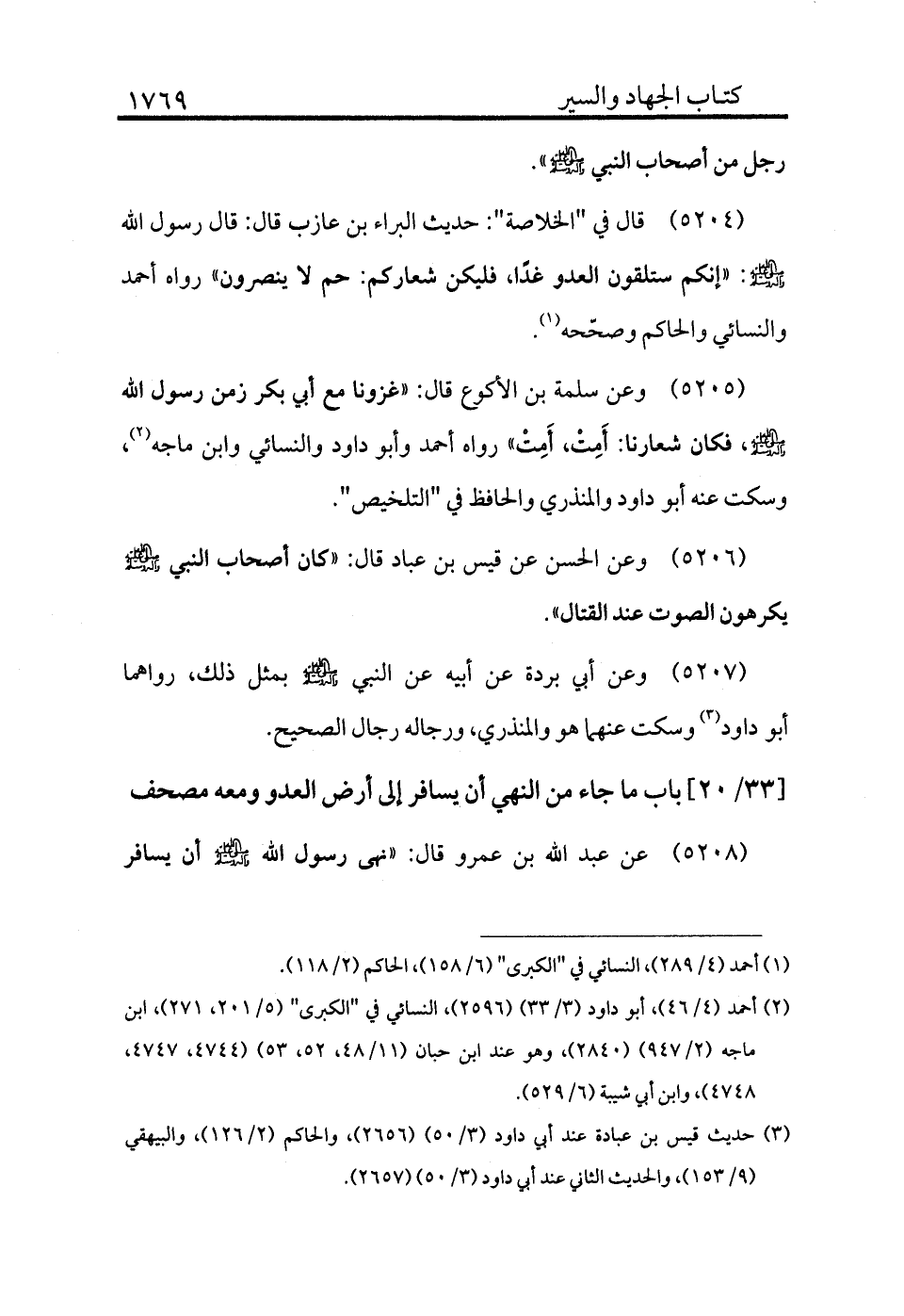 5205 - وعن سلمة بن الأكوع قال: «غزونا مع أبي بكر زمن رسول الله - صلى الله عليه وسلم -، فكان شعارنا أمت أمت» رواه أحمد وأبو داود والنسائي وابن ماجة (¬2) وسكت عنه أبو داود والمنذري والحافظ في "التلخيص".
