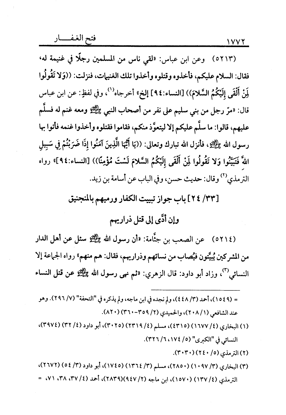 5213 - وعن ابن عباس: «لقي ناس من المسلمين رجلًا في غنيمة له فقال السلام عليكم فأخذوه وقتلوه وأخذوا تلك الغنيمات فنزلت: ((وَلا تَقُولُوا لِمَنْ أَلْقَى إِلَيْكُمُ السَّلامَ)) [النساء:94] إلخ» أخرجاه (¬1) ، وفي لفظ عن ابن عباس قال: «مرّ رجل من بني سليم على نفر من أصحاب النبي - صلى الله عليه وسلم - ومعه غنم له فسلم عليهم، قالوا: ما سلم عليكم إلا لتعوذ منكم فقاموا فقتلوه وأخذوا غنمه فأتوا بها رسول الله - صلى الله عليه وسلم - فأنزل الله تبارك وتعالى ((يَا أَيُّهَا الَّذِينَ آمَنُوا إِذَا ضَرَبْتُمْ فِي سَبِيلِ اللَّهِ فَتَبَيَّنُوا وَلا تَقُولُوا لِمَنْ أَلْقَى إِلَيْكُمُ السَّلامَ لَسْتَ مُؤْمِنًا)) [النساء:94] » رواه الترمذي (¬2) ، وقال: حديث حسن وفي الباب عن أسامة بن زيد.