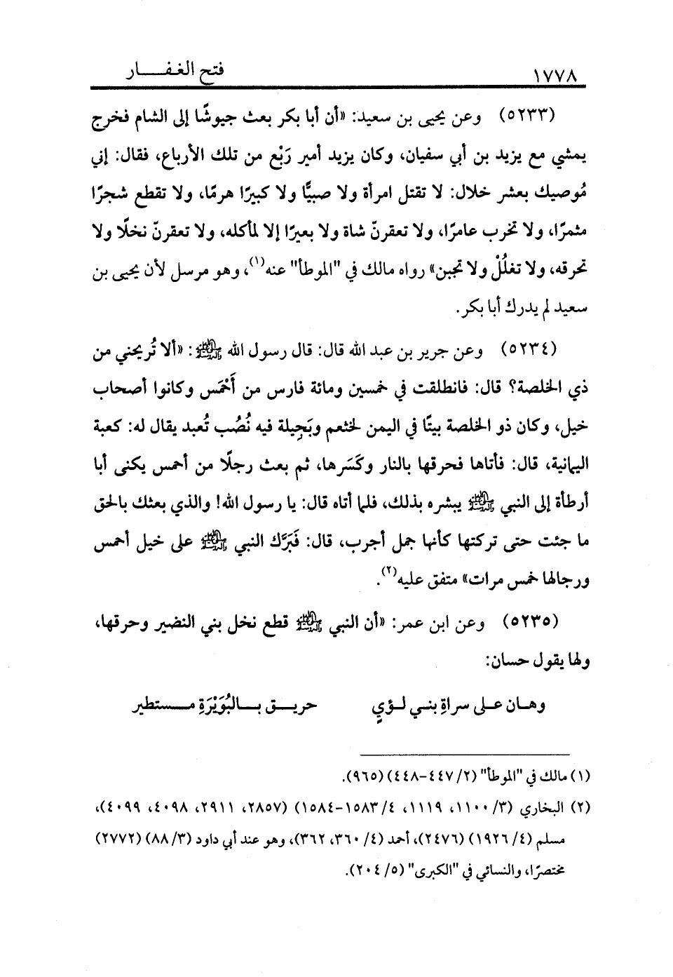 5233 - وعن يحيى بن سعيد «أن أبا بكر بعث جيوشًا إلى الشام فخرج يمشي مع يزيد بن أبي سفيان وكان يزيد أمير ربع من تلك الأرباع فقال: إني موصيك بعشر خلال: لا تقتل امرأة ولا صبيًا ولا كبيرًا هرمًا ولا تقطع شجرًا مثمرًا ولا تخرب عامرًا ولا تعقرن شاة ولا بعيرًا إلا لمأكله ولا تعقرن نخلًا ولا تحرقه ولا تغلغل ولا تجبن» رواه مالك في "الموطأ" عنه (¬1) وهو مرسل لأن يحيى بن سعيد لم يدرك أبا بكر.