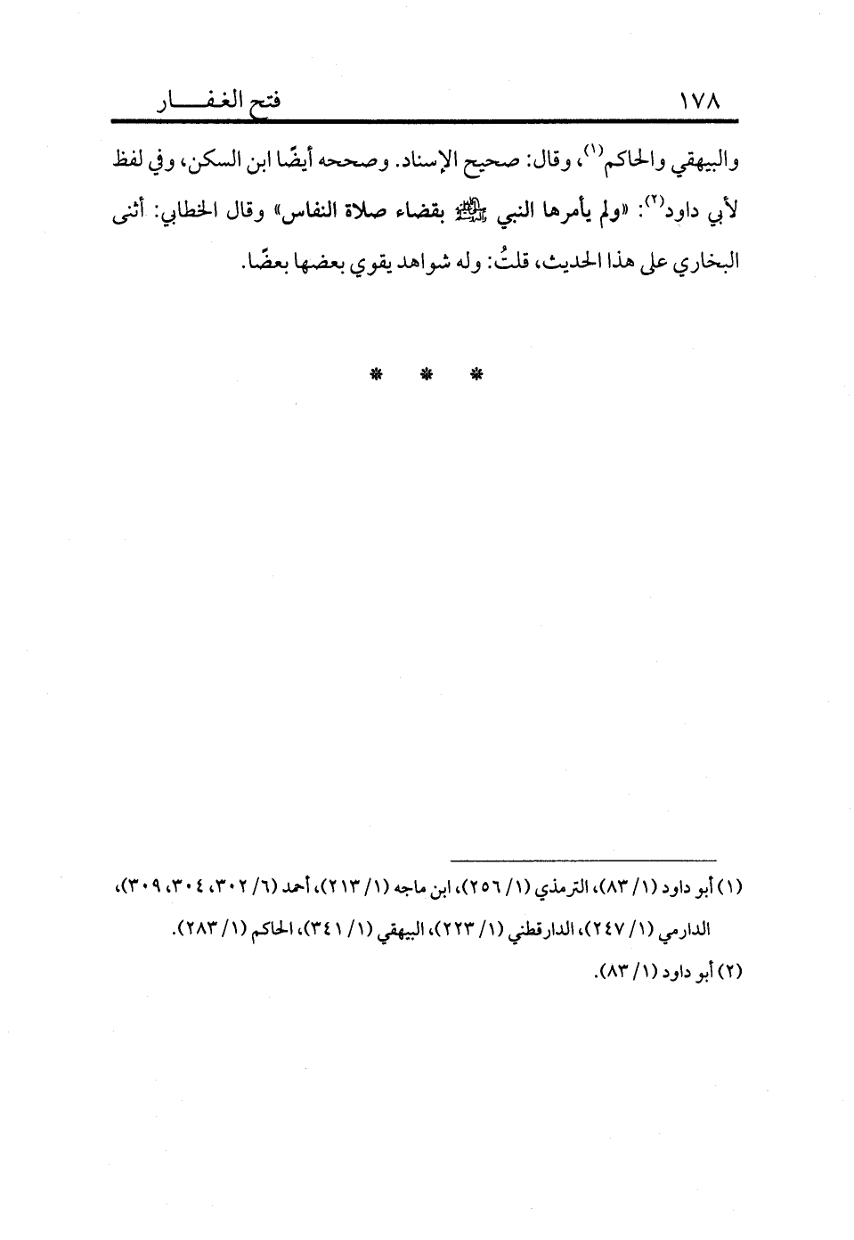 (¬1) أبو داود (1/83) ، الترمذي (1/256) ، ابن ماجه (1/213) ، أحمد (6/302، 304، 309) ، الدارمي (1/247) ، الدارقطني (1/223) ، البيهقي (1/341) ، الحاكم (1/283) .