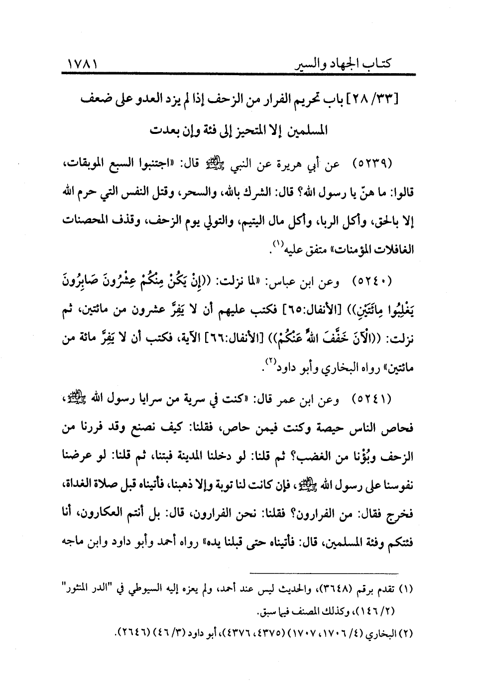 5240 - وعن ابن عباس: «لما نزلت: ((إِنْ يَكُنْ مِنْكُمْ عِشْرُونَ صَابِرُونَ يَغْلِبُوا مِائَتَيْنِ)) [لأنفال:65] فكتب عليهم أن لا يفر عشرون من مائتين، ثم نزلت: ((الْآنَ خَفَّفَ اللَّهُ عَنْكُمْ)) [لأنفال:66] الآية: فكتب أن لا يفر مائة من مائتين» رواه البخاري وأبو داود (¬2) .