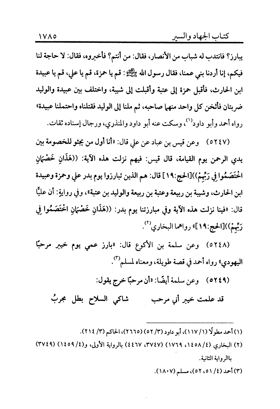 5248 - وعن سلمة بن الأكوع قال: «بارز عمي يوم خيبر مرحبًا اليهودي» رواه أحمد في قصة طويلة ومعناه لمسلم (¬3) .
