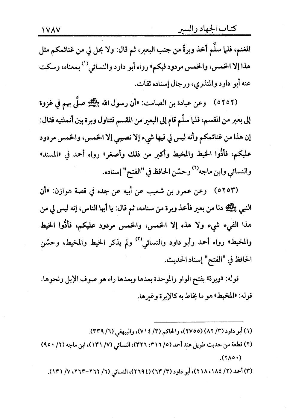 5253 - وعن عمرو بن شعيب عن أبيه عن جده في قصة هوازن «أن النبي - صلى الله عليه وسلم - دنى من بعير فأخذ وبرة من سنامه، ثم قال: يا أيها الناس إنه ليس لي من هذا الفي شيء ولا في هذه إلا الخمس والخمس مردود عليكم فأدوا الخيط والمخيط» رواه أحمد وأبو داود والنسائي (¬3) ولم يذكر الخيط والمخيط وحسن الحافظ في "الفتح" إسناد هذا الحديث.