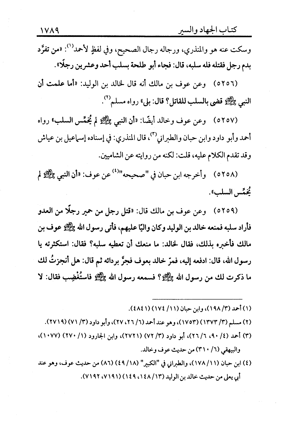 5258 - وأخرجه ابن حبان في "صحيحه" (¬4) عن عوف «أن النبي - صلى الله عليه وسلم - لم يخمس السلب» .