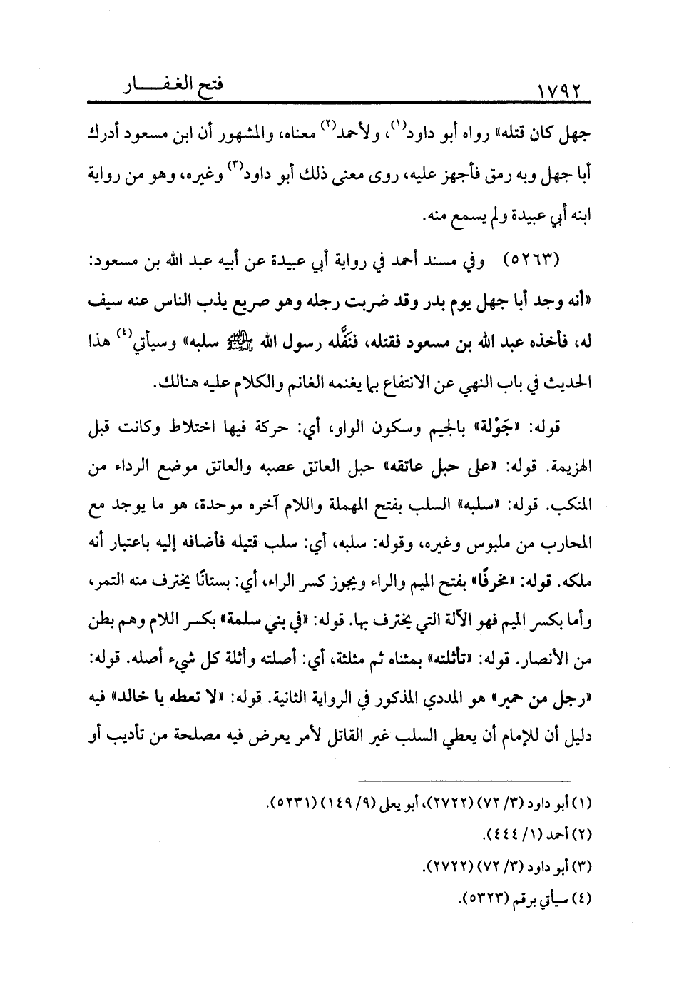 5263 - وفي مسند أحمد في رواية أبي عبيدة عن أبيه عبد الله بن مسعود «أنه وجد أبا جهل يوم بدر وقد ضربت رجله وهو صريع يذب الناس عنه سيف له فأخذه عبد الله بن مسعود فقتله فنفله رسول الله سلبه» وسيأتي (¬4) هذا الحديث في باب النهي عن الانتفاع بما يغنمه الغانم والكلام عليه هنالك.
