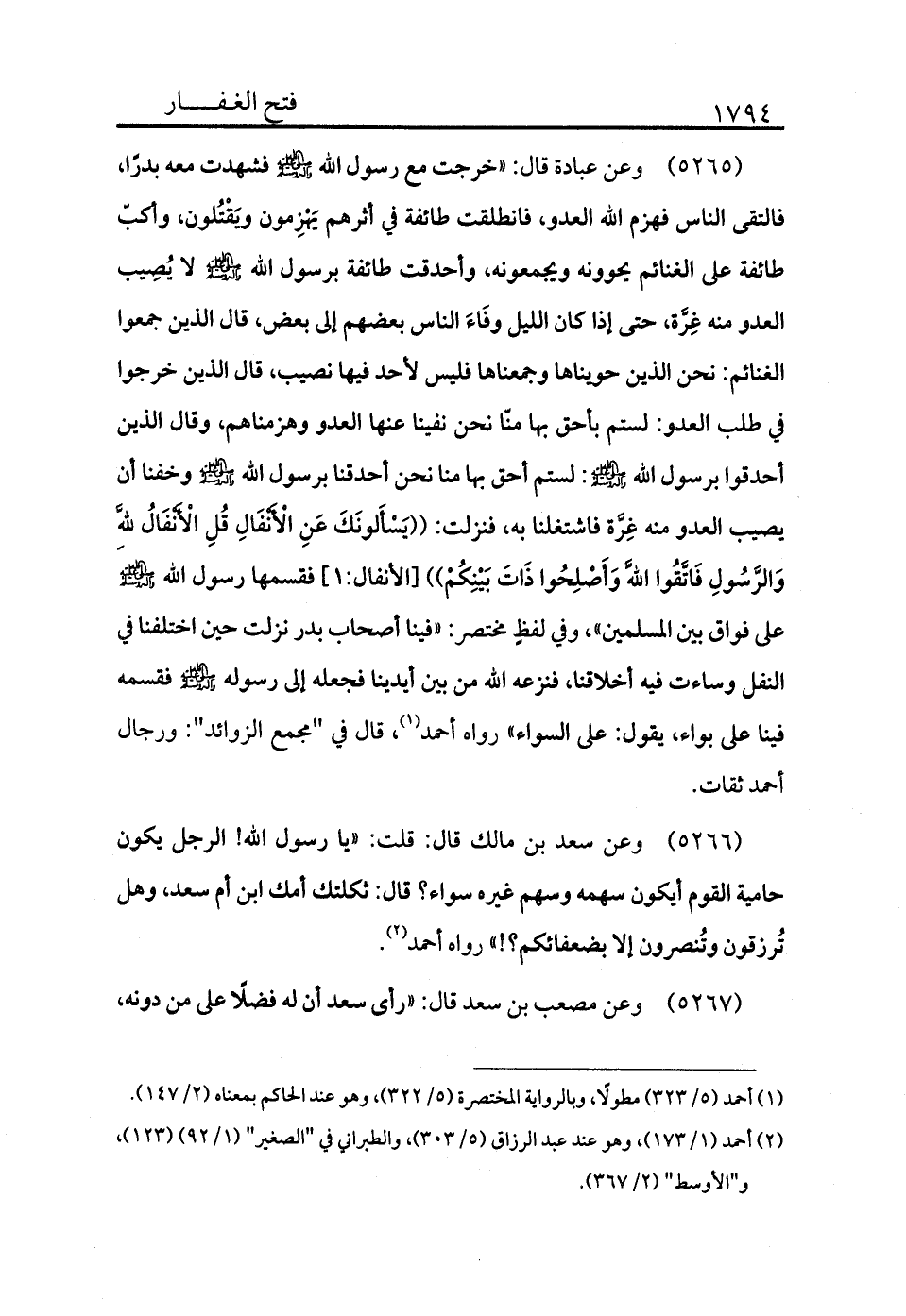 5265 - وعن عبادة قال: «خرجت مع رسول الله - صلى الله عليه وسلم - فشهدت معه بدرًا فالتقى الناس فهزم الله العدو فانطلقت طائفة في أثرهم يهزمون ويقتلون وأكبّ طائفة على الغنائم يحوونه ويجمعونه وأحدقت طائفة برسول الله - صلى الله عليه وسلم - لا يصيب العدو منه غرة حتى إذا كان الليل وفاء الناس بعضهم إلى بعض، قال الذين جمعوا الغنائم نحن الذين حويناها وجمعناها فليس لأحد فيها نصيب، قال الذين خرجوا في طلب العدو: لستم بأحق بها منا نحن نفينا عنها العدو وهزمناهم وقال الذين أحدقوا برسول الله - صلى الله عليه وسلم - لستم أحق بها منا نحن أحدقنا برسول الله - صلى الله عليه وسلم - وخفنا أن يصيب العدو منه غرة فاشتغلنا به فنزلت: ((يَسْأَلونَكَ عَنِ الْأَنْفَالِ قُلِ الْأَنْفَالُ لِلَّهِ وَالرَّسُولِ فَاتَّقُوا اللَّهَ وَأَصْلِحُوا ذَاتَ بَيْنِكُمْ)) [الأنفال:1] فقسمها رسول الله - صلى الله عليه وسلم - على فواق بين المسلمين» وفي لفظ مختصر: «فينا أصحاب بدر نزلت حين اختلفنا في النفل وساءت فيه أخلاقنا فنزعه الله من بين أيدينا فجعله إلى رسول الله - صلى الله عليه وسلم - فقسمه فينا على بواء يقول على السواء» رواه أحمد (¬1) ، قال في "مجمع الزوائد": ورجال أحمد ثقات.