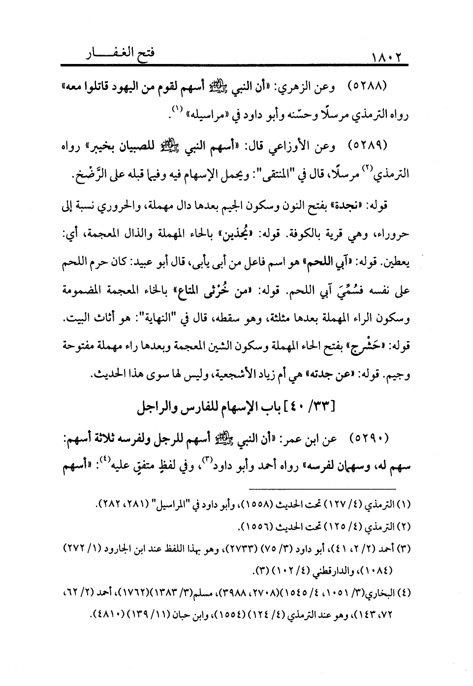 5290 - عن ابن عمر «أن النبي - صلى الله عليه وسلم - أسهم للرجل ولفرسه ثلاثة أسهم: سهم له، وسهمان لفرسه» رواه أحمد وأبو داود (¬3) ، وفي لفظ متفق عليه (¬4) «أسهم