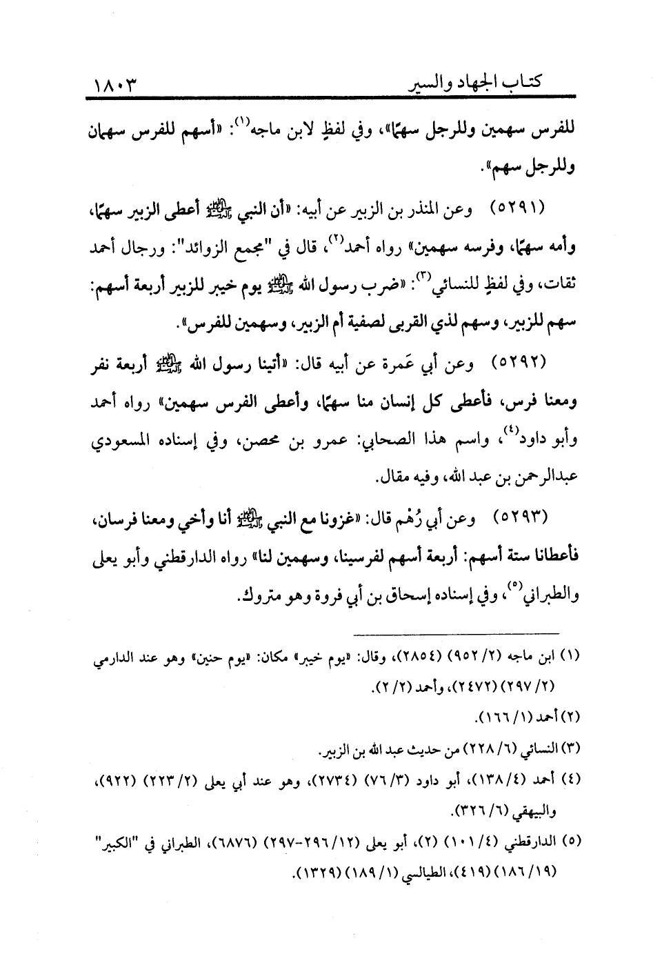 5292 - وعن أبي عمرة عن أبيه قال: «أتينا رسول الله - صلى الله عليه وسلم - أربعة نفر، ومعنا فرس فأعطى كل إنسان منا سهمًا، وأعطى الفرس سهمين» رواه أحمد وأبو داود (¬4) ، واسم هذا الصحابي عمرو بن محصن، وفي إسناده المسعودي عبد الرحمن بن عبد الله، وفيه مقال.