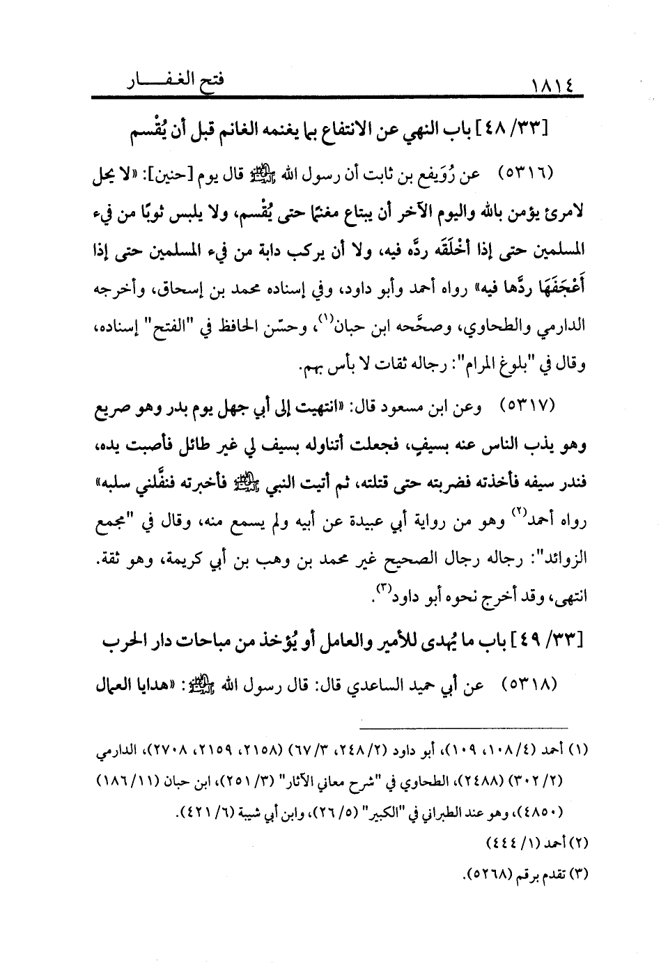 5316 - عن رويفع بن ثابت أن رسول الله - صلى الله عليه وسلم - قال يوم خيبر: «لا يحل لامرئ يؤمن بالله واليوم الآخر أن يبتاع مغنمًا حتى يقسم، ولا يلبس ثوبًا من فيء المسلمين حتى إذا أخلقه رده فيه، ولا أن يركب دابة من فيء المسلمين حتى إذا أعجفها ردها فيه» رواه أحمد وأبو داود في إسناده محمد بن إسحاق وأخرجه الدارمي والطحاوي، وصححه ابنه حبان (¬1) ، وحسن الحافظ في "الفتح" إسناده، وقال في "بلوغ المرام": رجاله ثقات لا بأس بهم.