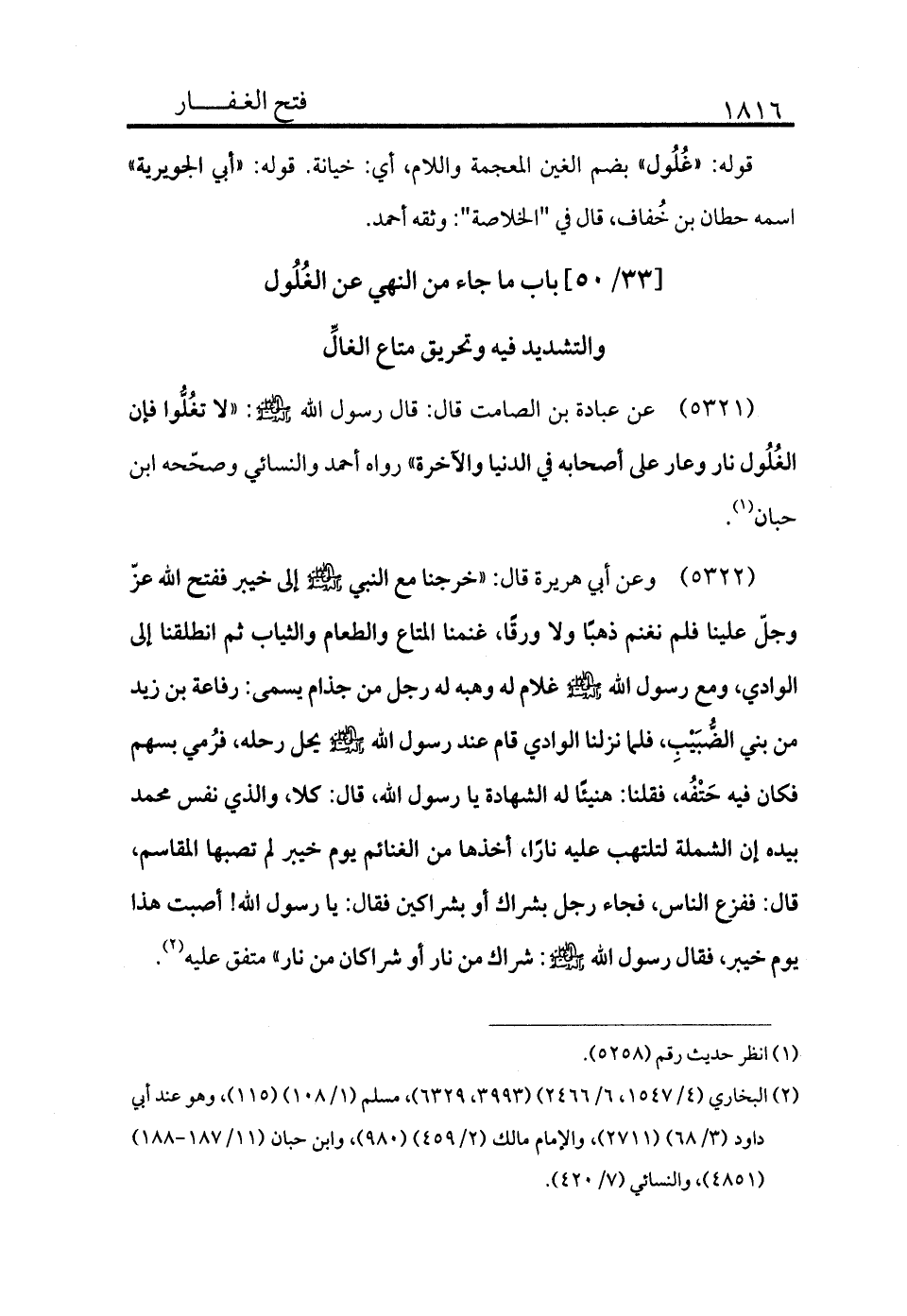 5321 - عن عبادة بن الصامت قال: قال رسول الله - صلى الله عليه وسلم -: «لا تغلوا فإن الغلول نار وعار على أصحابه في الدنيا والآخرة» رواه أحمد والنسائي وصححه ابن حبان (¬1) .