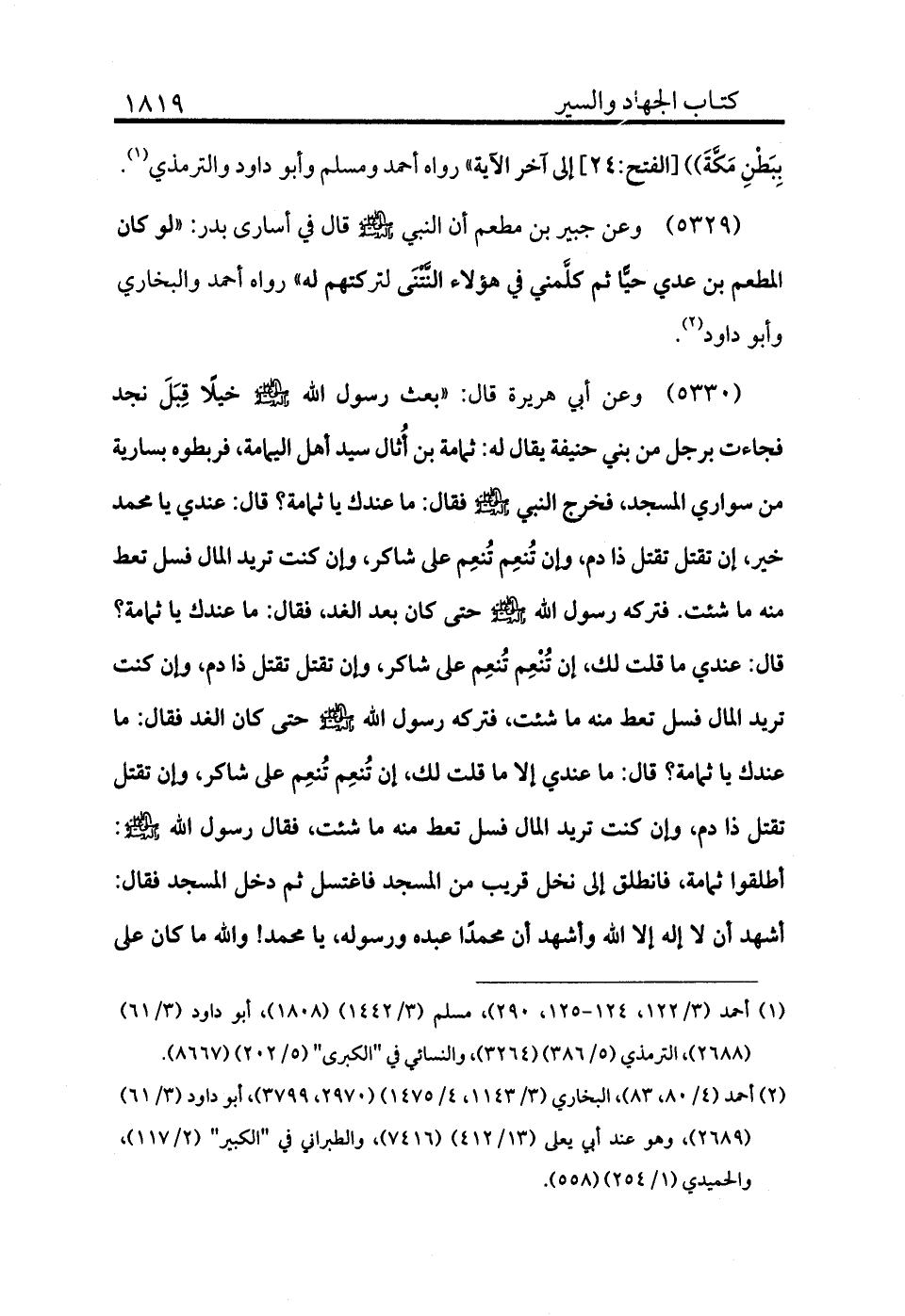 5330 - وعن أبي هريرة قال: «بعث رسول الله - صلى الله عليه وسلم - خيلًا قبل نجد فجاءت برجل من بني حنيفة يقال له ثمامة بن آثال سيد أهل اليمامة فربطوه بسارية من سواري المسجد، فخرج النبي - صلى الله عليه وسلم - فقال: ما عندك يا ثمامة؟ قال: عندي يا محمد خير، إن تقتل تقتل ذا دم، وإن تنعم تنعم على شاكر، وإن كنت تريد المال فسل تعط منه ما شئت. فتركه رسول الله حتى كان بعد الغد، فقال: ما عندك يا ثمامة؟ قال: عندي ما قلت لك: إن تنعم تنعم على شاكر، وإن تقتل تقتل ذا دم، وإن كنت تريد المال تعط منه ما شئت، فتركه رسول الله - صلى الله عليه وسلم - حتى كان الغد فقال: ما عندك يا ثمامة؟ قال: ما عندي إلا ما قلت لك: إن تنعم تنعم على شاكر، وإن تقتل تقتل ذا دم، وإن كنت تريد المال فسل تعط منه ما شئت، فقال رسول الله - صلى الله عليه وسلم -: أطلقوا ثمامة، فانطلق إلى نخل قريب من المسجد فاغتسل ثم دخل المسجد فقال: أشهد أن لا إله إلا الله وأشهد أن محمدًا عبده ورسوله. يا محمد! والله ما كان على