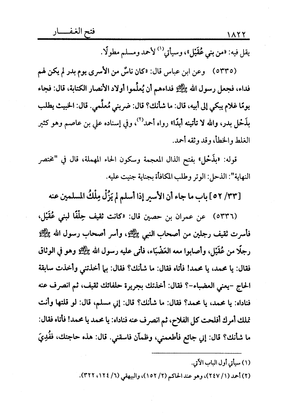 5336 - عن عمران بن حصين قال: «كانت ثقيف حلفًا لبني عقيل فأسرت ثقيف رجلين من أصحاب النبي - صلى الله عليه وسلم -، وأسر أصحاب رسول الله - صلى الله عليه وسلم - رجلًا من عقيل، وأصابوا معه العضباء، فأتى عليه رسول الله - صلى الله عليه وسلم - وهو في الوثاق فقال: يا محمد، يا محمد! فأتاه فقال: ما شأنك؟ فقال: بما أخذتني وأخذت سابقة الحاج -يعني العضباء-؟ فقال: أخذتك بجريرة حلفائك ثقيف. ثم انصرف عنه فناداه: يا محمد، يا محمد؟ فقال: ما شأنك؟ قال: إني مسلم. قال: لو قلتها وأنت تملك أمرك أفلحت كل الفلاح. ثم انصرف عنه فناداه: يا محمد يا محمد! فأتاه فقال: ما شأنك؟ قال: إني جائع فأطعمني وظمآن فاسقني. قال: هذه حاجتك ففدي