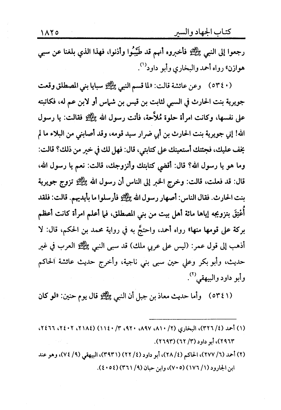 5340 - وعن عائشة قالت: «لما قسم النبي - صلى الله عليه وسلم - سبايا بني المصطلق وقعت جويرية بنت الحارث في السبي لثابت بن قيس بن شماس أو لابن عم له، فكاتبته على نفسها، وكانت امرأة حلوة ملاحة، فأتت رسول الله - صلى الله عليه وسلم - فقالت: يا رسول الله! إني جويرية بنت الحارث بن أبي ضرار سيد قومه، وقد أصابني من البلاء ما لم يخف عليك، فجئتك أستعينك على كتابتي. قال: فهل لك في خير من ذلك؟ قالت: وما هو يا رسول الله؟ قال: أقضي كتابتك وأتزوجك. قالت: نعم يا رسول الله. قال: قد فعلت. قالت: وخرج الخبر إلى الناس أن رسول الله تزوج جويرية بنت الحارث. فقال الناس: أصهار رسول الله فأرسلوا ما بأيديهم. قالت: فلقد أعتق بتزويجه إياها مائة أهل بيت من بني المصطلق، فما أعلم امرأة كانت أعظم بركة على قومها منها» رواه أحمد واحتج به في رواية محمد بن الحكم قال: لا أذهب إلى قول عمر: (ليس على عربي ملك) قد سبى النبي - صلى الله عليه وسلم - العرب في غير حديث، وأبو بكر وعلي حين سبى بني ناجية وأخرج حديث عائشة الحاكم وأبو داود والبيهقي (¬2) .