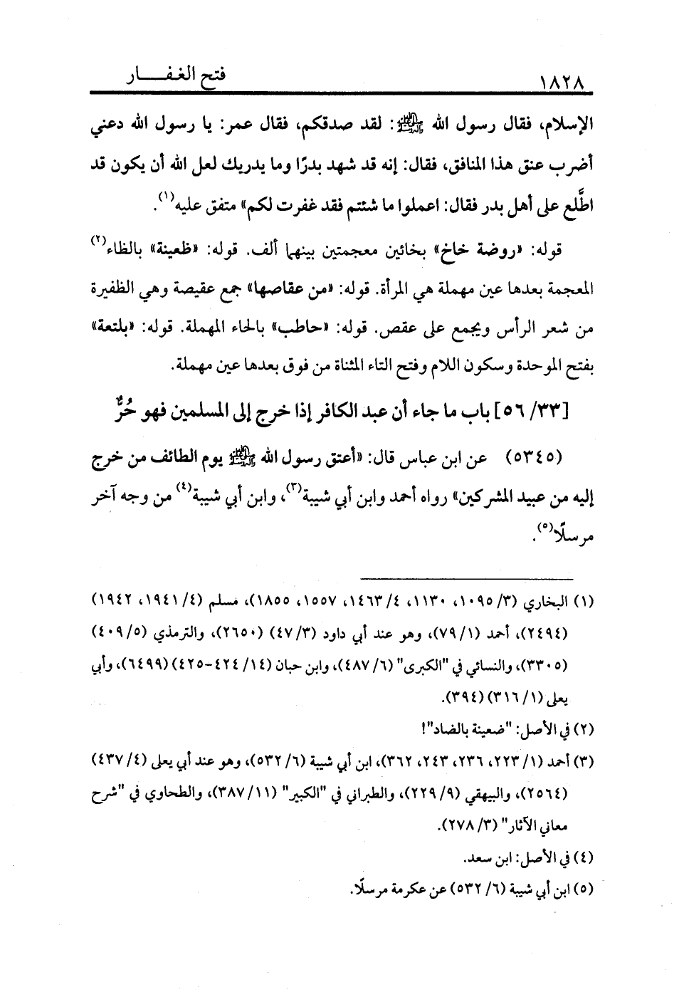 5345 - عن ابن عباس قال: «أعتق رسول الله - صلى الله عليه وسلم - يوم الطائف من خرج إليه من عبيد المشركين» رواه أحمد وابن أبي شيبة (¬2) ، وابن أبي شيبة (¬3) من وجه آخر مرسلًا (¬4) .