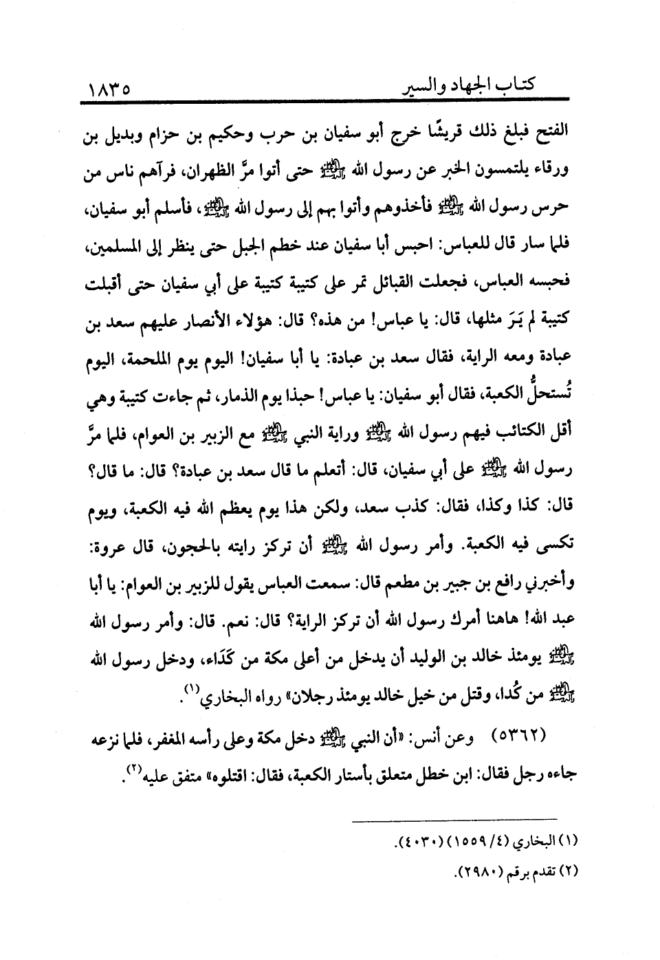الفتح فبلغ ذلك قريشًا خرج أبو سفيان بن حرب وحكيم بن حزام وبديل بن ورقا يلتمسون الخبر عن رسول الله - صلى الله عليه وسلم - حتى أتوا مر الظهران فرآهم ناس من حرس رسول الله - صلى الله عليه وسلم - فأخذوهم وأتوا بهم إلى رسول الله - صلى الله عليه وسلم -، فأسلم أبو سفيان، فلما سار قال للعباس: احبسوا أبا سفيان عند حطم الجبل حتى ينظر إلى المسلمين. فحبسه العباس، فجعلت القبائل تمر على كتيبة كتيبة على أبي سفيان حتى أقبلت كتيبة لم يرى مثلها، قال: يا عباس! من هذه؟ قال: هؤلاء الأنصار عليهم سعد بن عبادة ومعه الراية. فقال سعد بن عبادة: يا أبا سفيان! اليوم يوم يوم الملحمة، اليوم تستحل الكعبة. فقال أبو سفيان: يا عباس! حبذا يوم الذمار. ثم جاءه كتيبة وهي أقل الكتائب فيهم رسول الله - صلى الله عليه وسلم - وراية النبي - صلى الله عليه وسلم - مع الزبير بن العوام، فلما مر رسول الله على أبي سفيان، قال: أتعلم ما قال سعد بن عبادة؟ قال: ما قال؟ قال: كذا وكذا. فقال: كذب سعد، ولكن هذا يوم يعظم الله فيه الكعبة، ويوم تكسى فيه الكعبة. وأمر رسول الله - صلى الله عليه وسلم - أن تركز رايته بالحجون، قال عروة: أخبرني رافع بن جبير بن مطعم، قال: سمعت العباس يقول للزبير بن العوام: يا أبا عبد الله! هاهنا أمرك رسول الله أن تركز الراية؟ قال: نعم. قال: وأمر رسول الله - صلى الله عليه وسلم - يومئذ خالد بن الوليد أن يدخل من أعلى مكة من كداء، ودخل رسول الله - صلى الله عليه وسلم - من كدى، وقتل من خيل خالد يومئذ رجلان» رواه البخاري (¬1) .