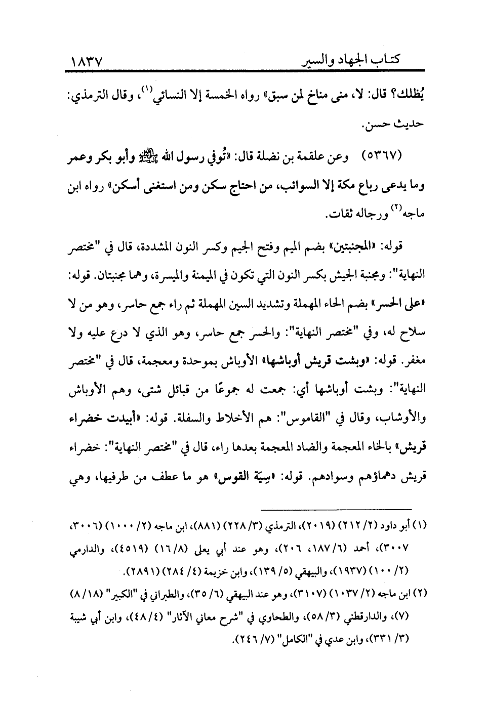 5367 - وعن علقمة بن نصلة قال: «توفي رسول الله وأبو بكر وعمر وما يدعوا رباع مكة إلا السوايب من احتاج سكن ومن استغنى أسكن» رواه ابن ماجة (¬2) ورجاله ثقات.