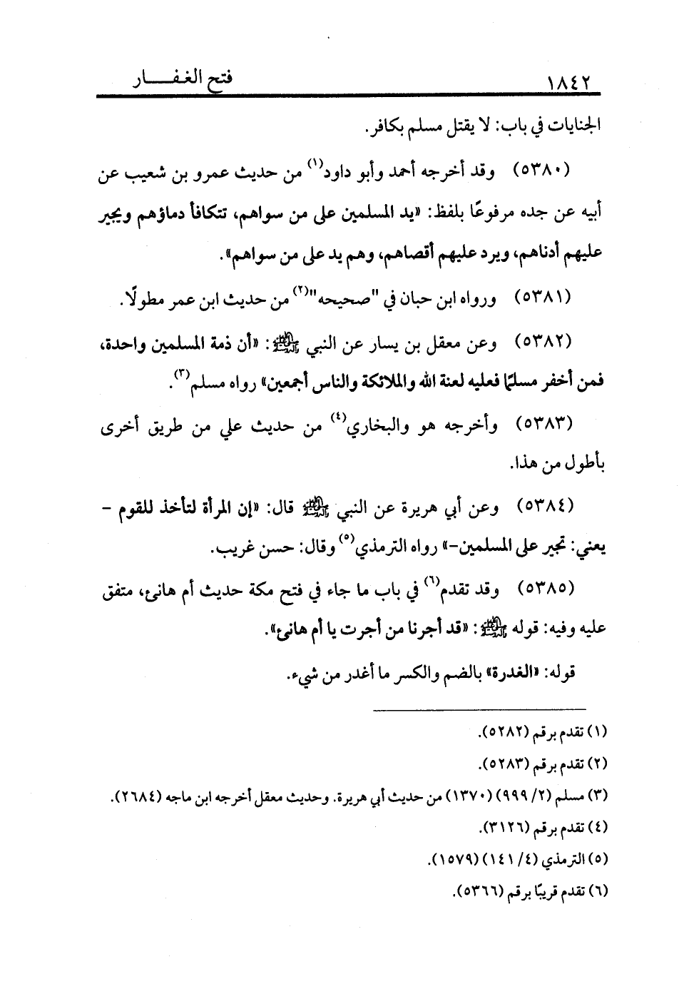 5382 - وعن معقل بن يسار عن النبي - صلى الله عليه وسلم - «أن ذمة المسلمين واحدة، فمن أخفر مسلمًا فعليه لعنة الله والملائكة والناس أجمعين» رواه مسلم (¬3) .