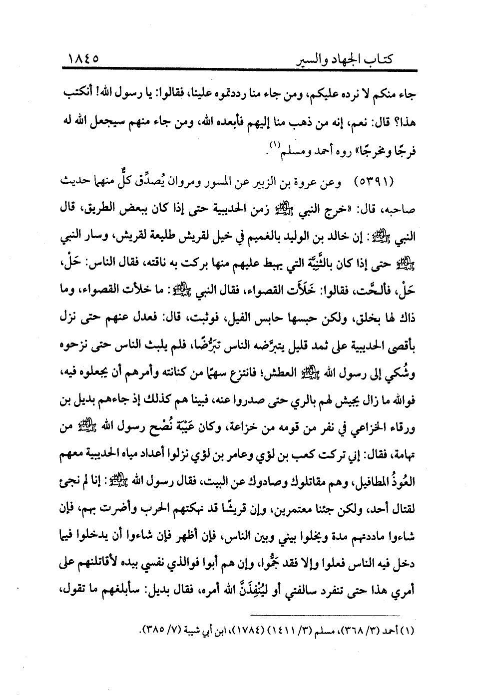 5391 - وعن عروة بن الزبير عن المسور ومروان يصدق كل منهما حديث صاحبه قال: «خرج النبي - صلى الله عليه وسلم - زمن الحديبية حتى إذا كان ببعض الطريق، قال النبي - صلى الله عليه وسلم -: إن خالد بن الوليد بالغميم في خيل لقريش طليعة لقريش, وسار النبي - صلى الله عليه وسلم - حتى إذا كان بالثنية التي يهبط عليهم منها بركت به ناقته، فقال الناس: حل، حل فالحت، فقالوا: خلأت القصوى. فقال النبي - صلى الله عليه وسلم -: ما خلأت القصوى وما ذاك لها بخلق، ولكن حبسها حابس الفيل. فوثبت، قال: فعدل عنهم حتى نزل بأقصى الحديبية على ثمد قليل يتربضه الناس تربضاً، فلم يلبث الناس حتى نزحوه وشكي إلى رسول الله - صلى الله عليه وسلم - العطش؛ فانتزع سهمًا من كنانته وأمرهم أن يجعلوه فيه، فوالله ما زال يجيش لهم بالري حتى صدروا عنه. فبينا هم كذلك إذ جاءهم بديل بن ورقاء الخزاعي في نفر من قومه من خزاعة، وكان عيبة نصح رسول الله - صلى الله عليه وسلم - من تهامة، فقال: إني تركت كعب بن لؤي وعامر بن لؤي نزلوا إعداد مياه الحديبية معهم العوذ المطافيل، وهم مقاتلوك وصادوك عن البيت. فقال رسول الله - صلى الله عليه وسلم -: إنا لم نجيء لقتال أحد، ولكن جئنا معتمرين، وإن قريشًا قد نهكتهم الحرب وأضرت بهم، فإن شاءوا ماددتهم مدة ويخلوا بيني وبين الناس فإن أظهر فإن شاءوا أن يدخلوا فيما دخل فيه الناس فعلوا وإلا فقد جموا، وإن هم أبوا فوالذي نفسي بيده لأقاتلنهم على أمري هذا حتى تنفرد سالفتي أو لينفذن الله أمره. فقال بديل: سأبلغهم ما تقول،