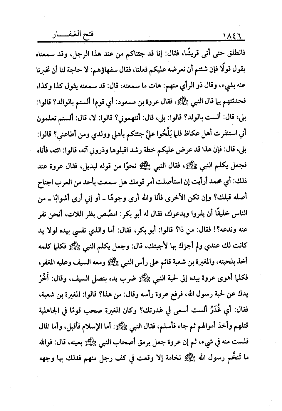 قال: فإن هذا قد عرض عليكم خطة رشد اقبلوها وذروني آته. قالوا: ايته. فأتاه فجعل يكلم النبي - صلى الله عليه وسلم - فقال النبي - صلى الله عليه وسلم - نحوًا من قوله لبديل بن ورقاء، فقال عروة عند ذلك: أي محمد أرأيت إن استأصلت أمر قومك هل سمعت بأحد من العرب اجتاح أصله قبلك؟ وإن تكن الأخرى فأنا والله أرى وجوهًا أو أني أرى أشوابًا من الناس خليقًا أن يفروا ويدعوك. فقال له أبو بكر: امصص بظر اللات.. أنحن نفر عنه وندعه؟! فقال: من ذا؟ قالوا: أبو بكر. فقال: أنا والذي نفسي بيده لولا يد كانت لك عندي ولم أجزك بها لأجبتك، قال: وجعل يكلم النبي - صلى الله عليه وسلم - فكلما كلمه أخذ بلحيته والمغيرة بن شعبة قائم على رأس النبي - صلى الله عليه وسلم - ومعه السيف وعليه المغفر، فكلما أهوى عروة بيده إلى لحية النبي - صلى الله عليه وسلم - ضرب يده بنصل السيف، وقال: أخر يدك عن لحية رسول الله. فرفع عروة رأسه وقال: من هذا؟ قالوا: المغيرة بن شعبة. فقال: أي غدر لست أسعى في غدرتك. وكان المغيرة صحب قومًا في الجاهلية قتلهم وأخذ أموالهم ثم جاء فأسلم فقال النبي - صلى الله عليه وسلم -: أما الإسلام فأقبل وأما المال فلست منه في شيء. ثم إن عروة جعل يرمق أصحاب النبي - صلى الله عليه وسلم - بعينه، قال: فوالله ما تنخم رسول الله - صلى الله عليه وسلم - نخامة إلا وقعت في كف رجل منهم فدلك بها وجهه وجلده، وإذا أمرهم بأمر ابتدروه، وإذا توضأ كادوا يقتتلون على وضوءه، وإذا تكلم خفوا أصواتهم عنده وما يحدون إليه النظر تعظيمًا له. فرجع عروة إلى أصحابه فقال: أي قوم! فوالله لقد وفدت على الملوك ووفدت على كسرى وقيصر والنجاشي، والله إن رأيت ملكًا قط يعظمه أصحابه ما يعظم أصحاب محمد محمدًا، والله إن تنخم نخامة إلا وقعت في كف رجل منهم فدلك بها وجهه