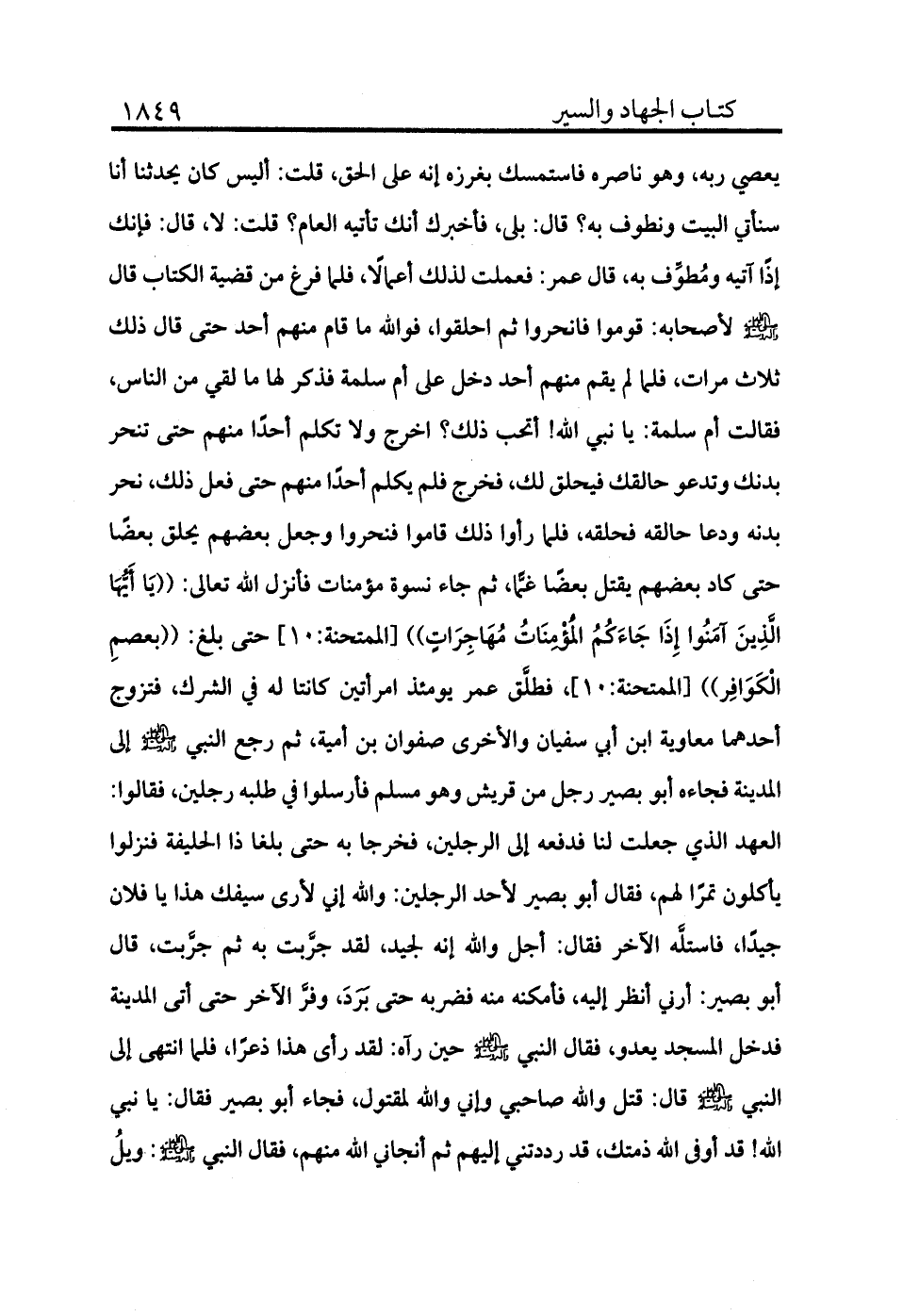 فلما رأوا ذلك قاموا فنحروا وجعل بعضهم يحلق بعضًا حتى كاد بعضهم يقتل بعضًا غمًا، ثم جاء نسوة مؤمنات فأنزل الله تعالى: ((يَا أَيُّهَا الَّذِينَ آمَنُوا إِذَا جَاءَكُمُ الْمُؤْمِنَاتُ مُهَاجِرَاتٍ)) [الممتحنة:10] حتى بلغ ((عِصَمِ الْكَوَافِر)) [الممتحنة:10] فطلق عمر يومئذ امرأتين كانتا له في الشرك فتزوج أحدهما معاوية بن أبي سفيان والأخرى صفوان بن أمية، ثم رجع النبي - صلى الله عليه وسلم - إلى المدينة فجاءه أبو بصير رجل من قريش وهو مسلم فأرسلوا في طلبه رجلين، فقالوا: العهد الذي جعلت لنا فدفعه إلى الرجلين، فخرجا به حتى بلغا ذا الحليفة فنزلوا يأكلون تمرًا لهم، فقال أبو بصير لأحد الرجلين: والله إني لأرى سيفك هذا يا فلان جيدًا فاستله الآخر، فقال: أجل والله إنه لجيد. لقد جربت به ثم جربت، قال أبو بصير أرني أنظر إليه، فأمكنه منه فضربه حتى برد، وفر الآخر حتى أتى المدينة فدخل المسجد يعدو، فقال النبي - صلى الله عليه وسلم - حين رآه: لقد رأى هذا ذعرًا. فلما انتهى إلى النبي - صلى الله عليه وسلم - قال: قتل والله صاحبي وإني والله لمقتول. فجاء أبو بصير فقال: يا نبي الله! قد أوفى الله ذمتك، قد رددتني إليهم ثم أنجاني الله منهم. فقال النبي - صلى الله عليه وسلم -: ويل