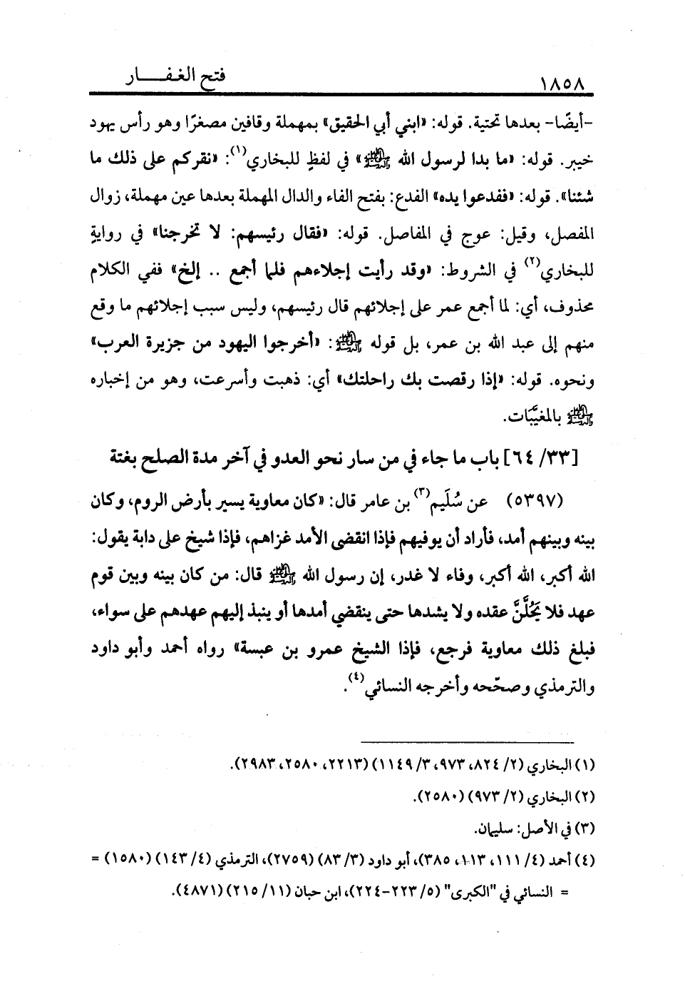 5397 - عن سليم (¬3) بن عامر قال: «كان معاوية يسير بأرض الروم، وكان بينه وبينهم أمد، فأراد أن يوفيهم فإذا نقض الأمد غزاهم، فإذا شيخ على دابة يقول: الله أكبر، الله أكبر. وفاء لا غدر إن رسول الله - صلى الله عليه وسلم - قال: من كان بينه وبين قوم عهد فلا يحلن عقده ولا يشدها حتى ينقضي أمدها أو ينبذ إليهم عهدهم على سواء فبلغ ذلك معاوية فرجع فإذا الشيخ عمرو بن عبسة» رواه أحمد وأبو داود والترمذي وصححه وأخرجه النسائي (¬4) .