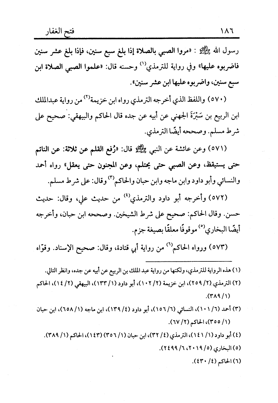 571 - وعن عائشة عن النبي - صلى الله عليه وسلم - قال: «رُفع القلم عن ثلاثة: عن النائم حتى يستيقظ، وعن الصبي حتى يحتلم، وعن المجنون حتى يعقل» رواه أحمد والنسائي وأبو داود وابن ماجه وابن حبان والحاكم (¬3) وقال: على شرط مسلم.