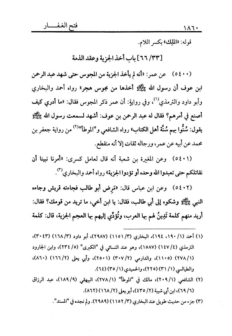 5401 - وعن المغيرة بن شعبة أنه قال لعامل كسرى: «أمرنا نبينا أن نقاتلكم حتى تعبدوا الله وحده أو تؤدوا الجزية» رواه أحمد والبخاري (¬3) .