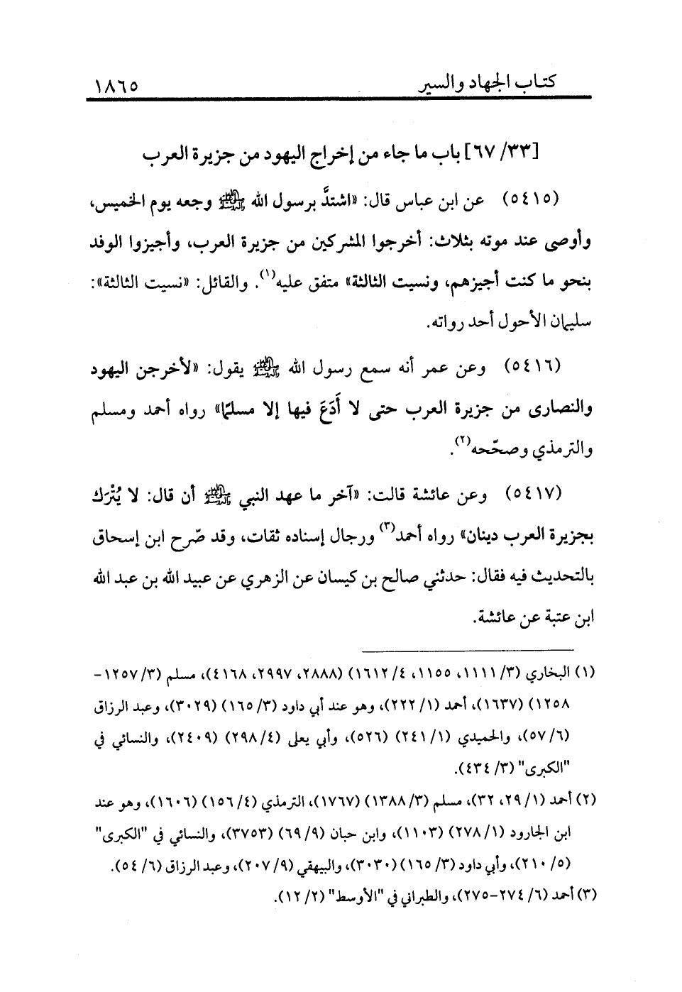 5416 - وعن عمر أنه سمع رسول الله - صلى الله عليه وسلم - يقول: «لأخرجن اليهود والنصارى من جزيرة العرب حتى لا أدع فيها إلا مسلمًا» رواه أحمد ومسلم والترمذي وصححه (¬2) .