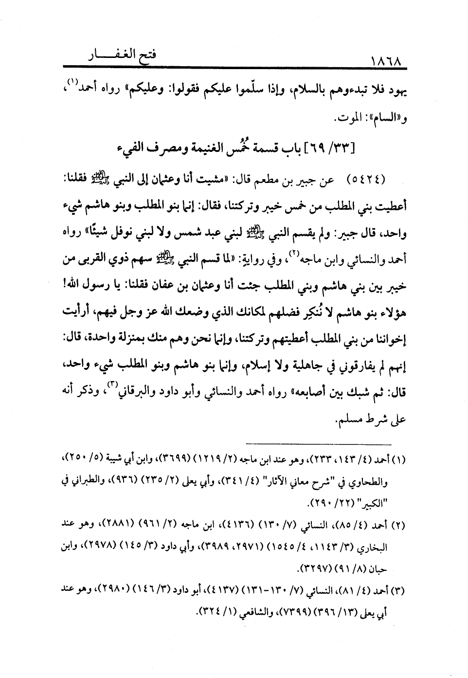 5424 - عن جبير بن مطعم قال: «مشيت أنا وعثمان إلى النبي - صلى الله عليه وسلم - فقلنا: أعطيت بني المطلب من خمس خيبر وتركتنا. فقال: إنما بنو المطلب وبنو هاشم شيء واحد. قال جبير: ولم يقسم النبي - صلى الله عليه وسلم - لبني عبد شمس ولا لبني نوفل شيئًا» رواه أحمد والنسائي وابن ماجة (¬2) . وفي رواية «لما قسم النبي - صلى الله عليه وسلم - سهم ذوي القربى من خيبر بين بني هاشم وبني المطلب جئت أنا وعثمان بن عفان فقلنا: يا رسول الله! هؤلاء بنو هاشم لا ننكر فضلهم لمكانك الذي وضعك الله عز وجل فيهم، أرأيت إخواننا من بني المطلب أعطيتهم وتركتنا، وإنما نحن وهم منك بمنزلة واحدة. قال: إنهم لم يفارقوني في جاهلية ولا إسلام، وإنما بنو هاشم وبنو المطلب شيء واحد. ثم شبك بين أصابعه» رواه أحمد والنسائي وأبو داود والبرقاني (¬3) ، وذكر أنه على شرط مسلم.