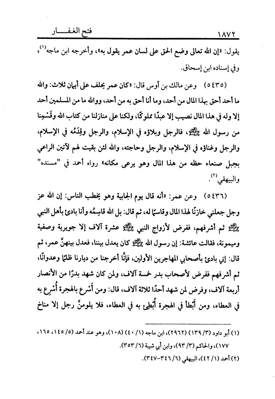 5435 - وعن مالك بن أوس قال: «كان عمر يحلف على أيمان ثلاث: والله ما أحد أحق بهذا المال من أحد، وما أنا أحق به من أحد، ووالله ما من المسلمين أحد إلا وله في هذا المال نصيب إلا عبدًا مملوكًا، ولكنا على منازلنا من كتاب الله وقسمنا من رسول الله - صلى الله عليه وسلم -، فالرجل وبلاؤه في الإسلام، والرجل وقدمه في الإسلام، والرجل وعناؤه في الإسلام، والرجل وحاجته، والله لأن بقيت لهم لآتين الراعي بجبل صنعاء حظه من هذا المال وهو يرعى مكانه» رواه أحمد في "مسنده" والبيهقي (¬2) .