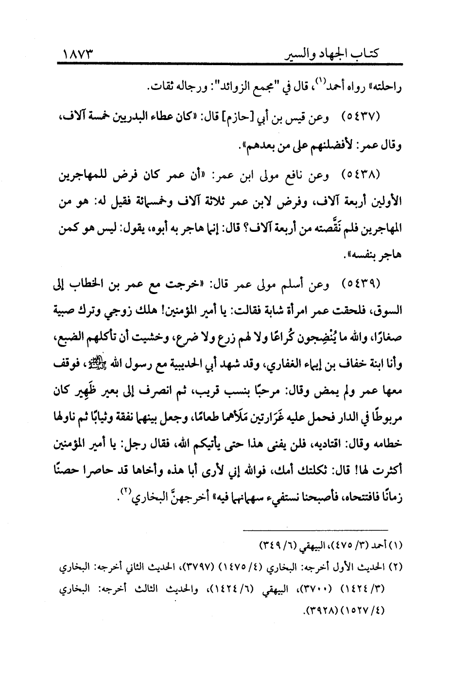 5438 - وعن نافع مولى ابن عمر «أن عمر كان فرض للمهاجرين الأولين أربعة آلاف وفرض لابن عمر ثلاثة آلاف وخمس مائة فقيل له: هو من المهاجرين فلم نقصته من أربعة آلاف؟ قال: إنما هاجر به أبوه. يقول: ليس هو كمن هاجر بنفسه» .