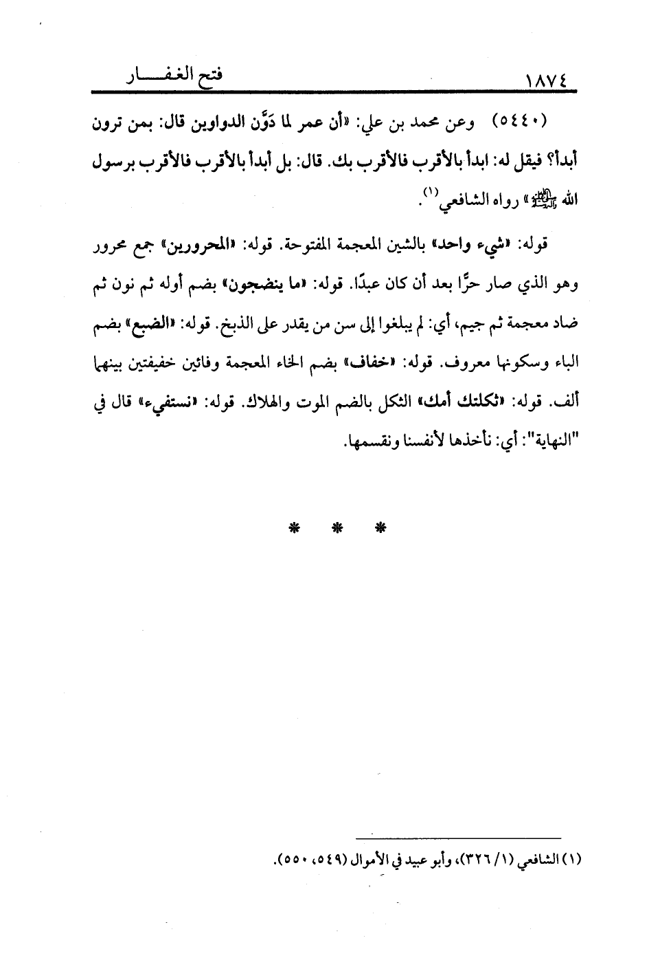 5440 - وعن محمد بن علي «أن عمر لما دون الدواوين قال: بمن ترون أبدأ؟ فيقل له: ابدأ بالأقرب فالأقرب لك. قال: بل أبدأ بالأقرب فالأقرب برسول الله - صلى الله عليه وسلم -» رواه الشافعي (¬1) .