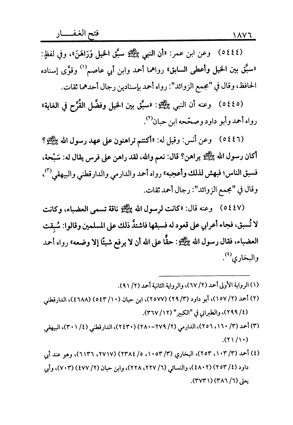 5445 - وعنه أن النبي - صلى الله عليه وسلم - «سبق بين الخيل وفضل القرح في الغابة» رواه أحمد وأبو داود وصححه ابن حبان (¬2) .