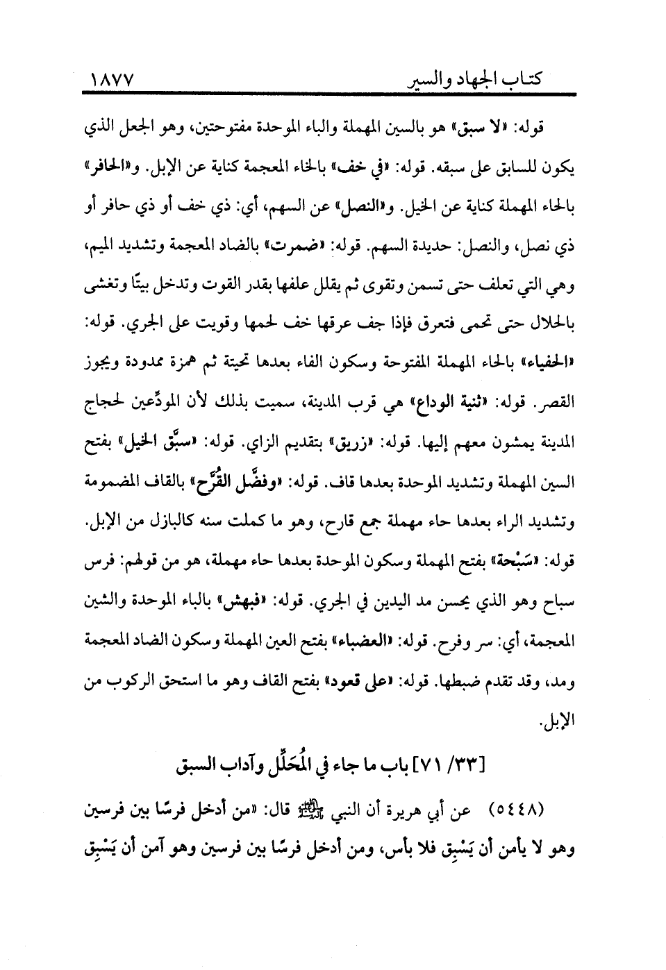 قوله: «لا سبق» هو بالسين المهملة والباء الموحدة مفتوحتين، وهو الجعل الذي يكون للسابق على سبقه. قوله: «في خف» بالخاء المعجمة كناية عن الإبل، والحافر: بالحاء المهملة كناية عن الخيل والنصل عن السهم أي ذي خف أو ذي حافر أو ذي نصل والنصل حديدة السهم. قوله: «ضمرت» بالضاد المعجمة وتشديد الميم وهي التي تعلف حتى تسمن وتقوى ثم يقلل علفها بقدر القوت وتدخل بيتًا وتغشى بالحلال حتى تحمى فتعرق فإذا جف عرقها خف لحمها وقويت على الجري. قوله: «الحفياء» بالحاء المهملة المفتوحة وسكون الفاء بعدها تحيته ثم همزة ممدودة ويجوز القصر. قوله: «ثنية الوداع» هي قرب المدينة، سميت بذلك لأن المودعين لحجاج المدينة يمشون معهم إليها. قوله: «زريق» بتقديم الزاي. قوله: «سبق الخيل» بفتح السين المهملة وتشديد الموحدة بعدها قاف. قوله: «وفضل القرح» بالقاف المضمومة وتشديد الراء بعدها حاء مهملة جمع قارح وهو ما كملت سنه كالبازل من الإبل. قوله: «سبحه» بفتح المهملة وسكون الموحدة بعدها حاء مهملة هو من قولهم: فرس سباح وهو الذي يحسن مد اليدين في الجري. قوله: «فبهش» بالباء الموحدة والشين المعجمة أي سر وفرح. قوله: «العضباء» بفتح العين المهملة وسكون الضاد المعجمة ومد وقد تقدم ضبطها. قوله: «على قعود» بفتح القاف وهو ما استحق الركوب من الإبل.