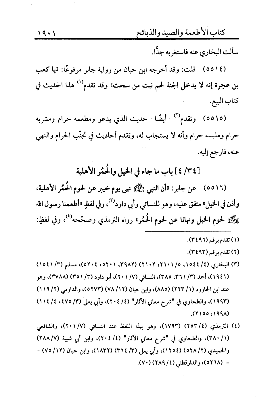 5516 - عن جابر «أن النبي - صلى الله عليه وسلم - نهى يوم خيبر عن لحوم الحمر الأهلية، وأذن في الخيل» متفق عليه، وهو للنسائي وأبي داود (¬3) ، وفي لفظ «أطعمنا رسول الله - صلى الله عليه وسلم - لحوم الخيل ونهانا عن لحوم الحمر» رواه الترمذي وصححه (¬4) ، وفي لفظ