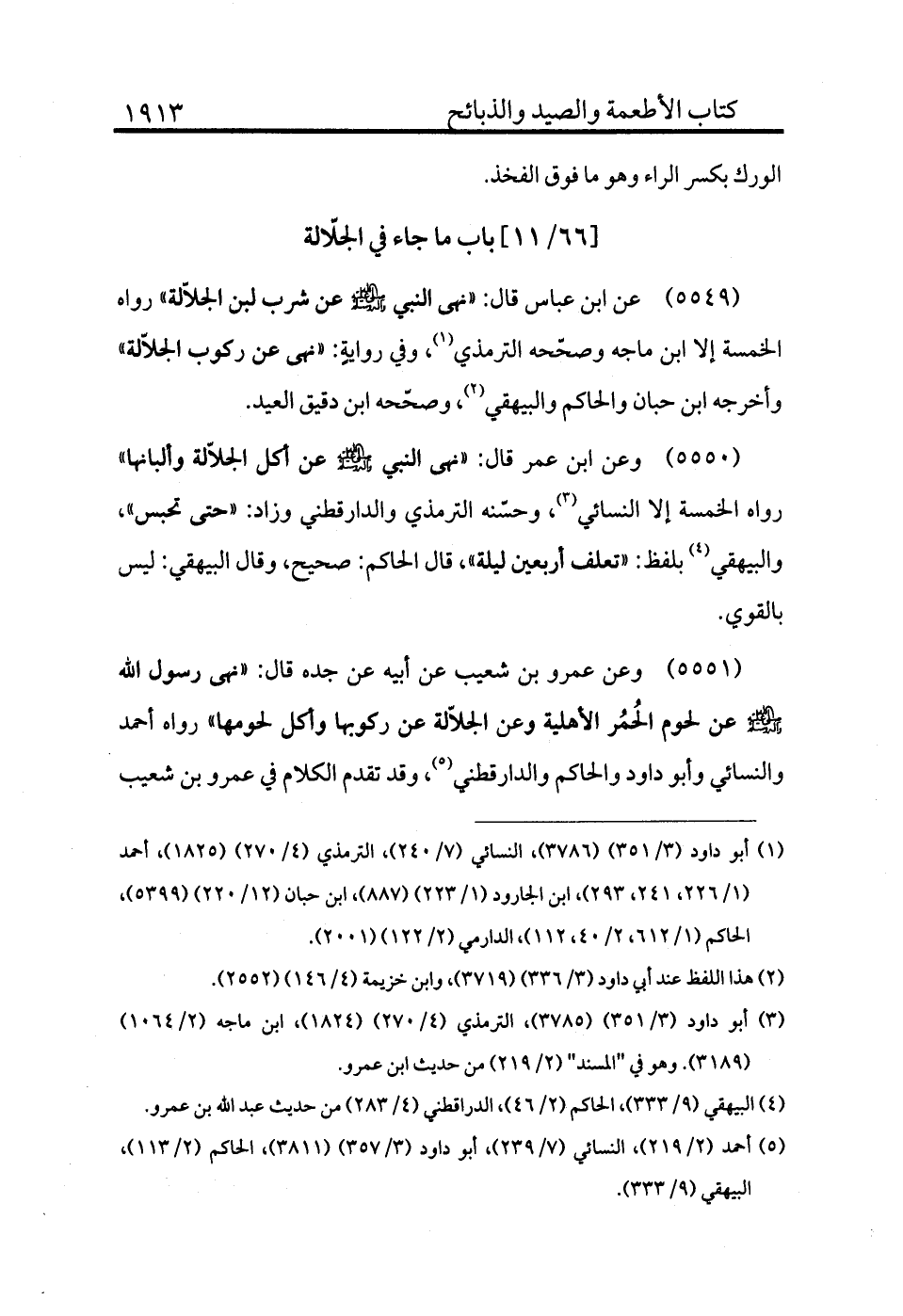 5551 - وعن عمرو بن شعيب عن أبيه عن جده قال: «نهى رسول الله - صلى الله عليه وسلم - عن لحوم الحمر الأهلية وعن الجلالة عن ركوبها وأكل لحومها» رواه أحمد والنسائي وأبو داود والحاكم والدارقطني (¬5) ، وقد تقدم الكلام في عمرو بن شعيب