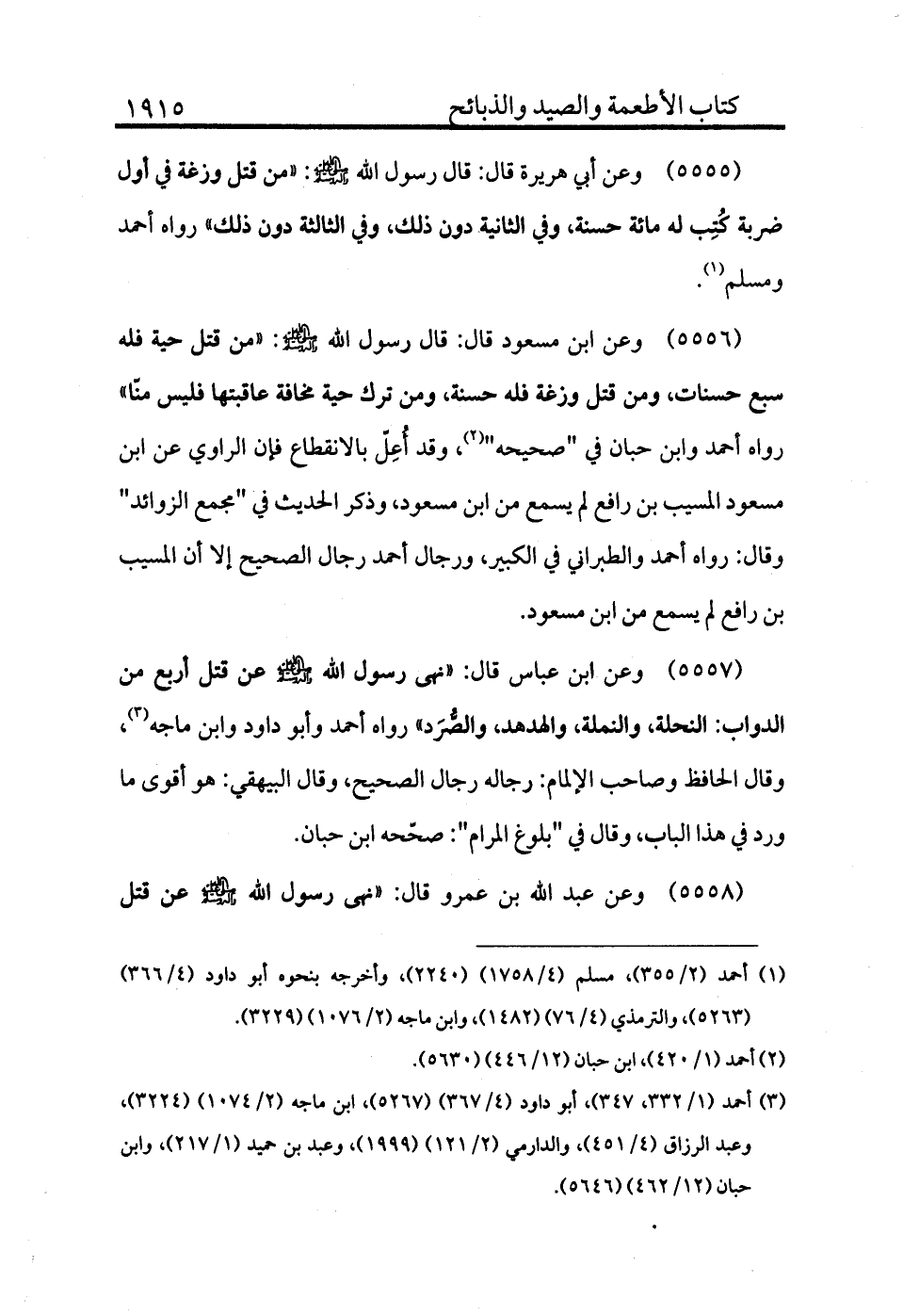 5557 - وعن ابن عباس قال: «نهى رسول الله - صلى الله عليه وسلم - عن قتل أربع من الدواب: النحلة، والنملة، والهدهد، والصرد» رواه أحمد وأبو داود وابن ماجة (¬3) ، وقال الحافظ وصاحب الإلمام: رجاله رجال الصحيح، وقال البيهقي: هو أقوى مما ورد في هذا الباب. وقال في "بلوغ المرام": صححه ابن حبان.