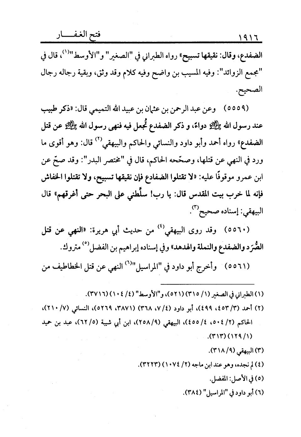 5559 - وعن عبد الرحمن بن عثمان بن عبيد الله التميمي قال: «ذكر طبيب عند رسول الله - صلى الله عليه وسلم - دواءً، وذكر الضفدع تجعل فيه فنهى رسول الله - صلى الله عليه وسلم - عن قتل الضفدع» رواه أحمد وأبو داود والنسائي والحاكم والبيهقي (¬2) ، قال: وهو أقوى ما ورد في النهي عن قتلها. وصححه الحاكم، قال في "مختصر البدر": وقد صح عن ابن عمرو موقوفًا عليه «لا تقتلوا الضفادع فإن نقيقها تسبيح، ولا تقتلوا الخفاش فإنه لما خرب بيت المقدس قال: يا رب! سلطني على البحر حتى أغرقهم» قال البيهقي: إسناده صحيح (¬3) .